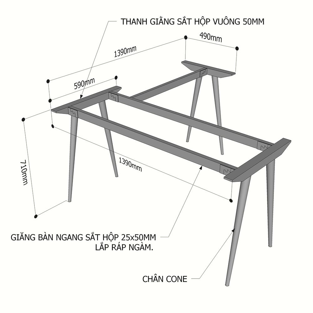 Kích thước chân sắt lắp ráp cho bàn chữ L 140x140cm ( mặt bàn chính 140x60cm,mặt phụ 80x50cm)