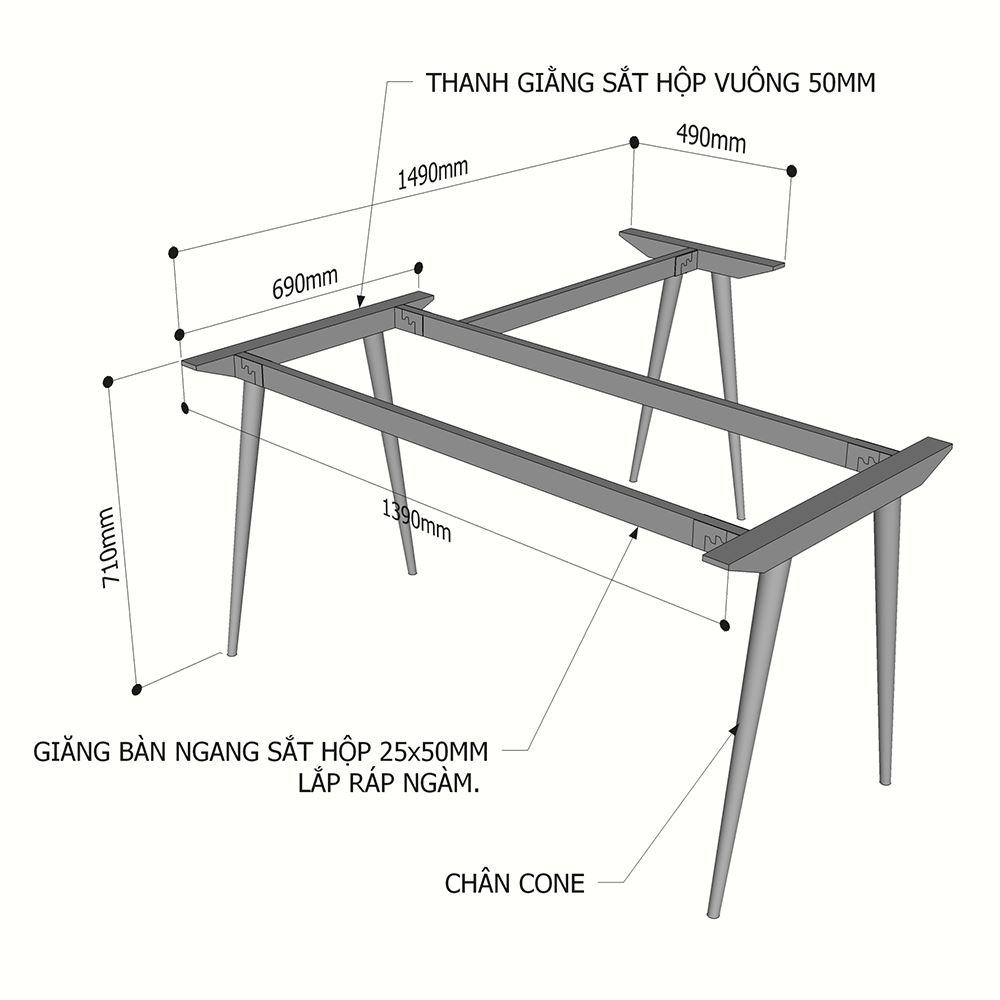 Kích thước chân sắt cho bàn chữ L ( mặt bàn chính 140x70cm, mặt phụ 80x50cm)