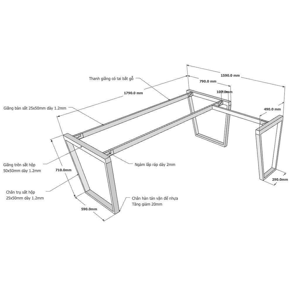 Kích thước chân sắt cho bàn chữ L mặt bàn chính 180x80cm + mặt phụ 80x50cm