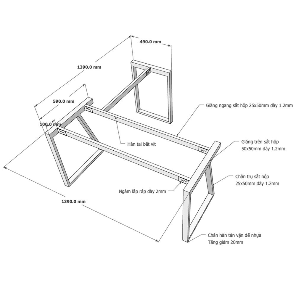 Kích thước chân sắt lắp ráp cho bàn góc L 140x140x75cm