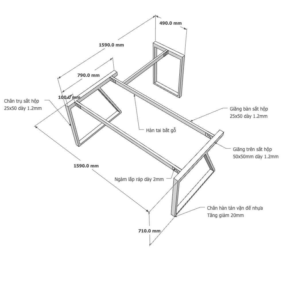 Kích thước chân sắt lắp ráp cho bàn góc L 160x160x75cm