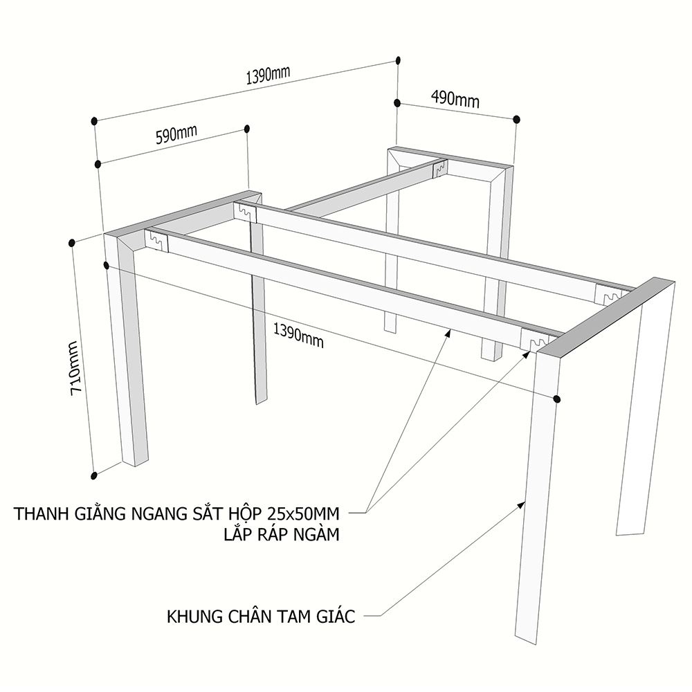 Kích thước chân sắt lắp ráp hệ Trian cho bàn chữ L 140x140cm
