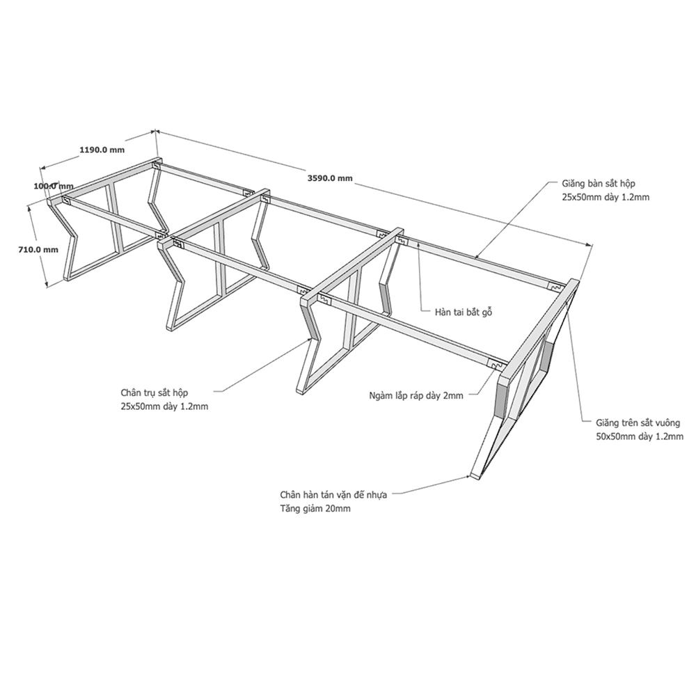 Kích thước chân sắt lắp ráp cho bàn cụm 6 360x120cm