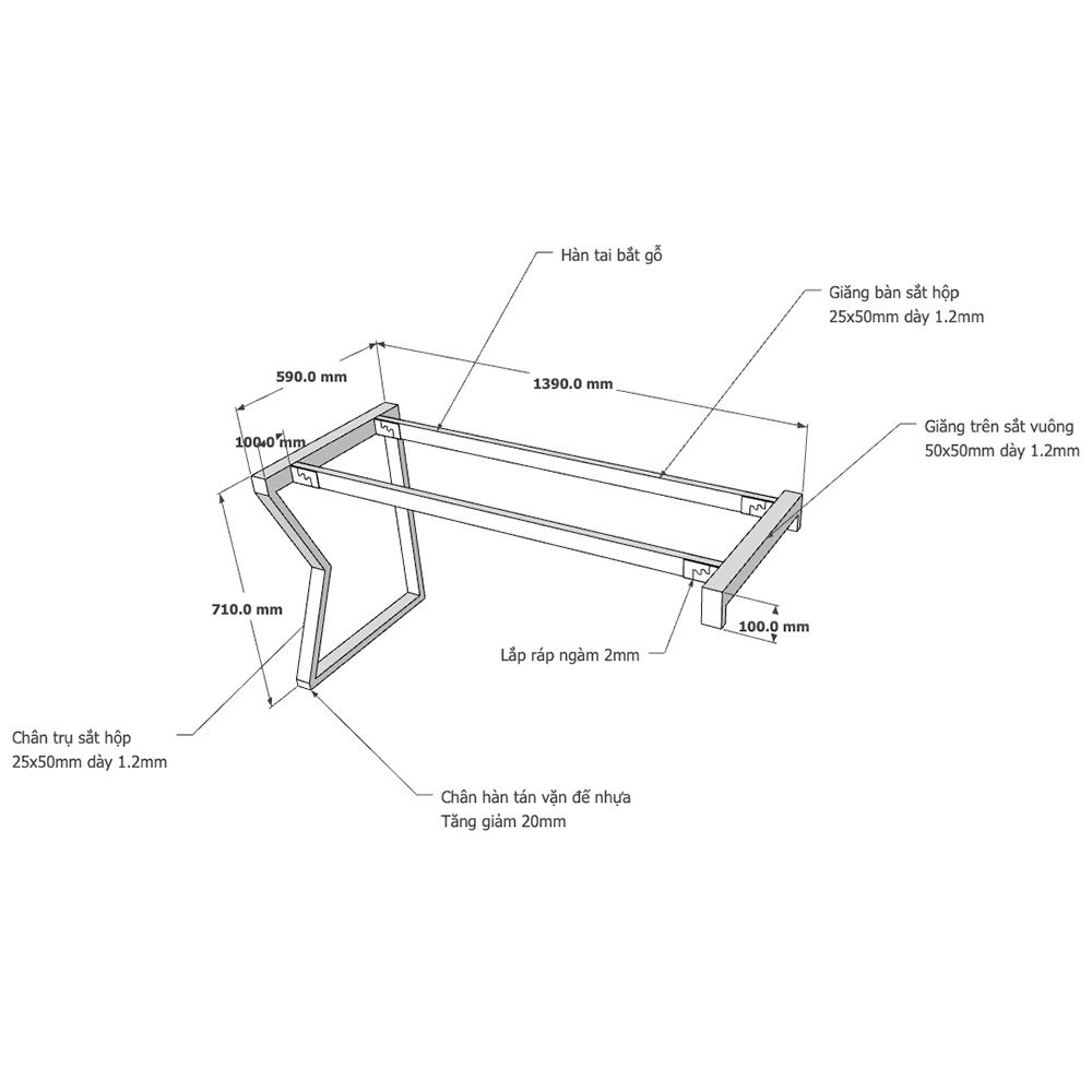Kích thứoc chân sắt lắp ráp cho bàn gác tủ 140x60cm