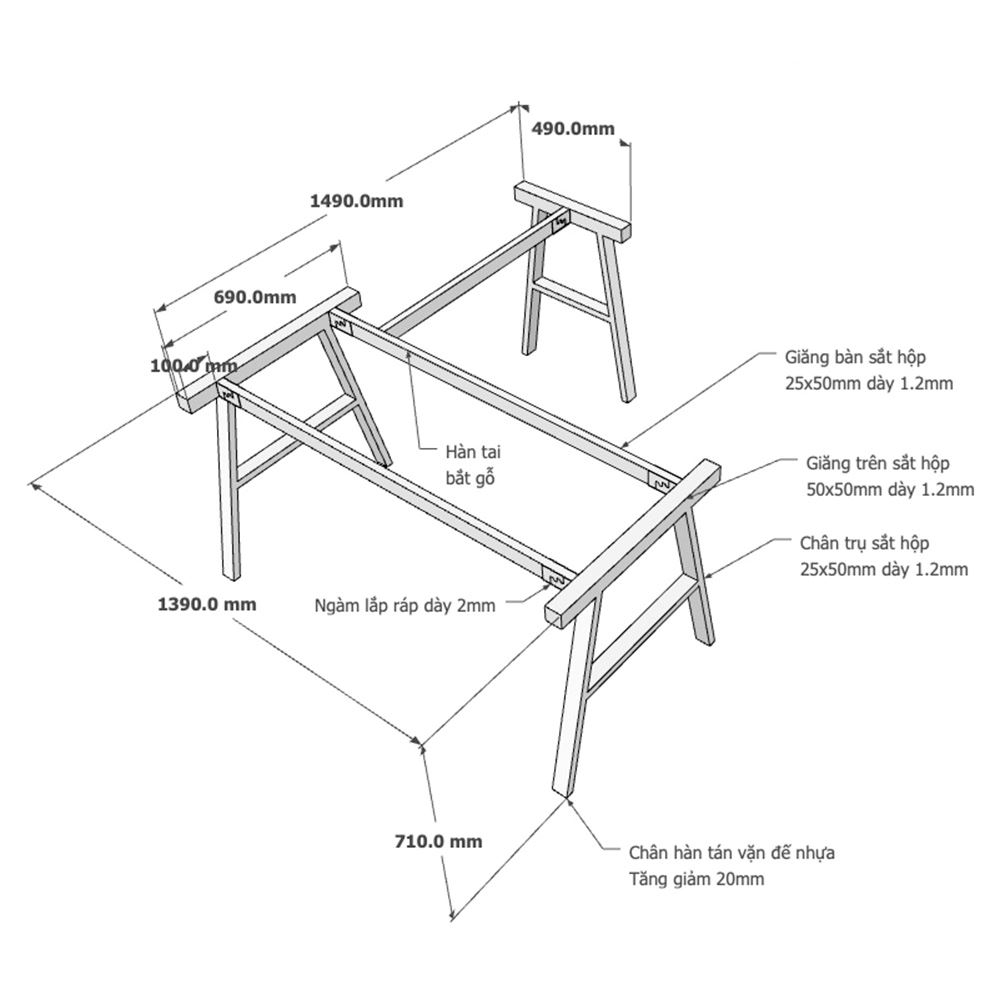 Kích thước chân sắt lắp ráp hệ Aconcept cho bàn góc L 140x150cm