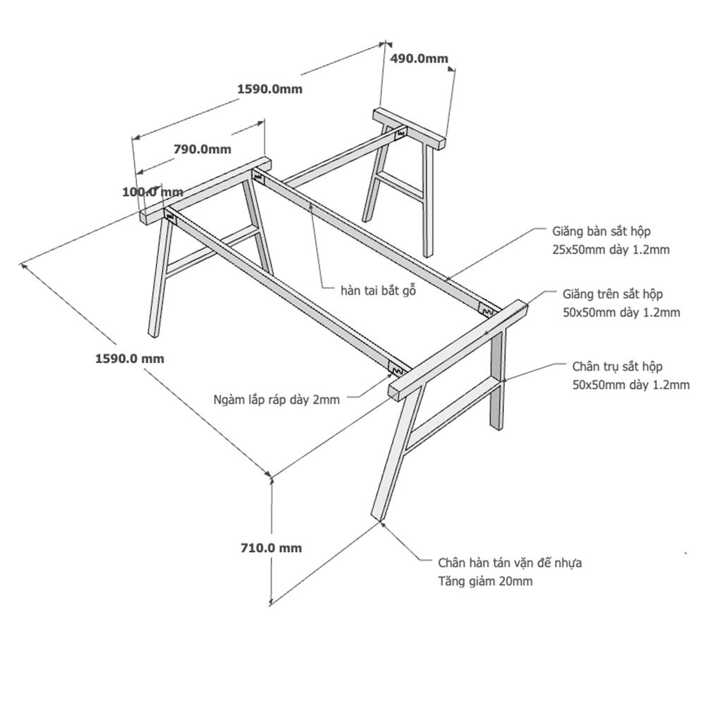Kích thước chân sắt lắp ráp hệ Aconcept cho bàn góc L 160x160x75cm