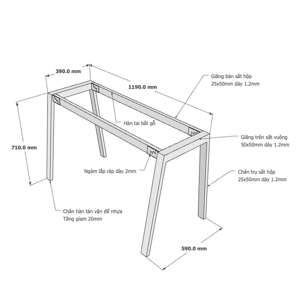 Kích thuớc chân sắt lắp ráp hệ Aton cho bàn 120x60cm