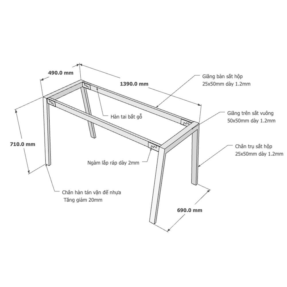 Kích thước chân sắt lắp ráp cho bàn 140x70cm