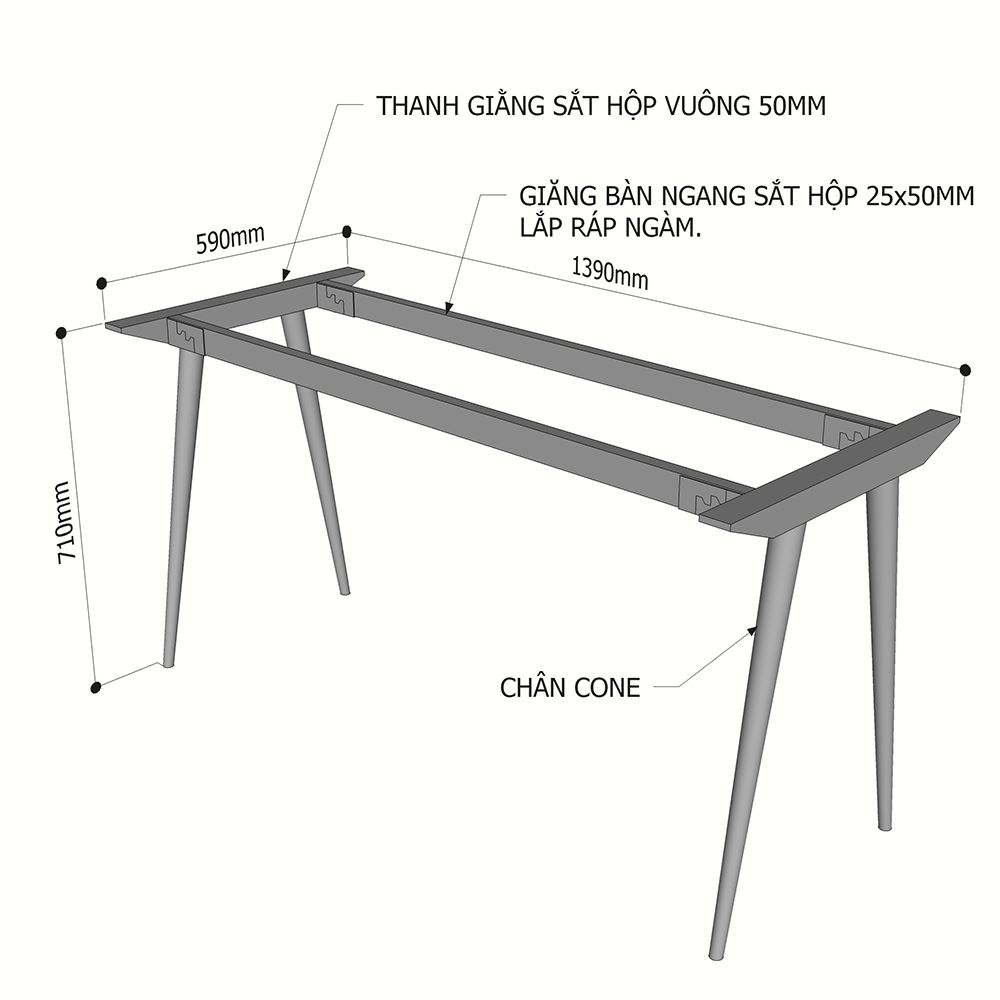 Kích thước chân sắt hệ CONE cho bàn 140x60cm