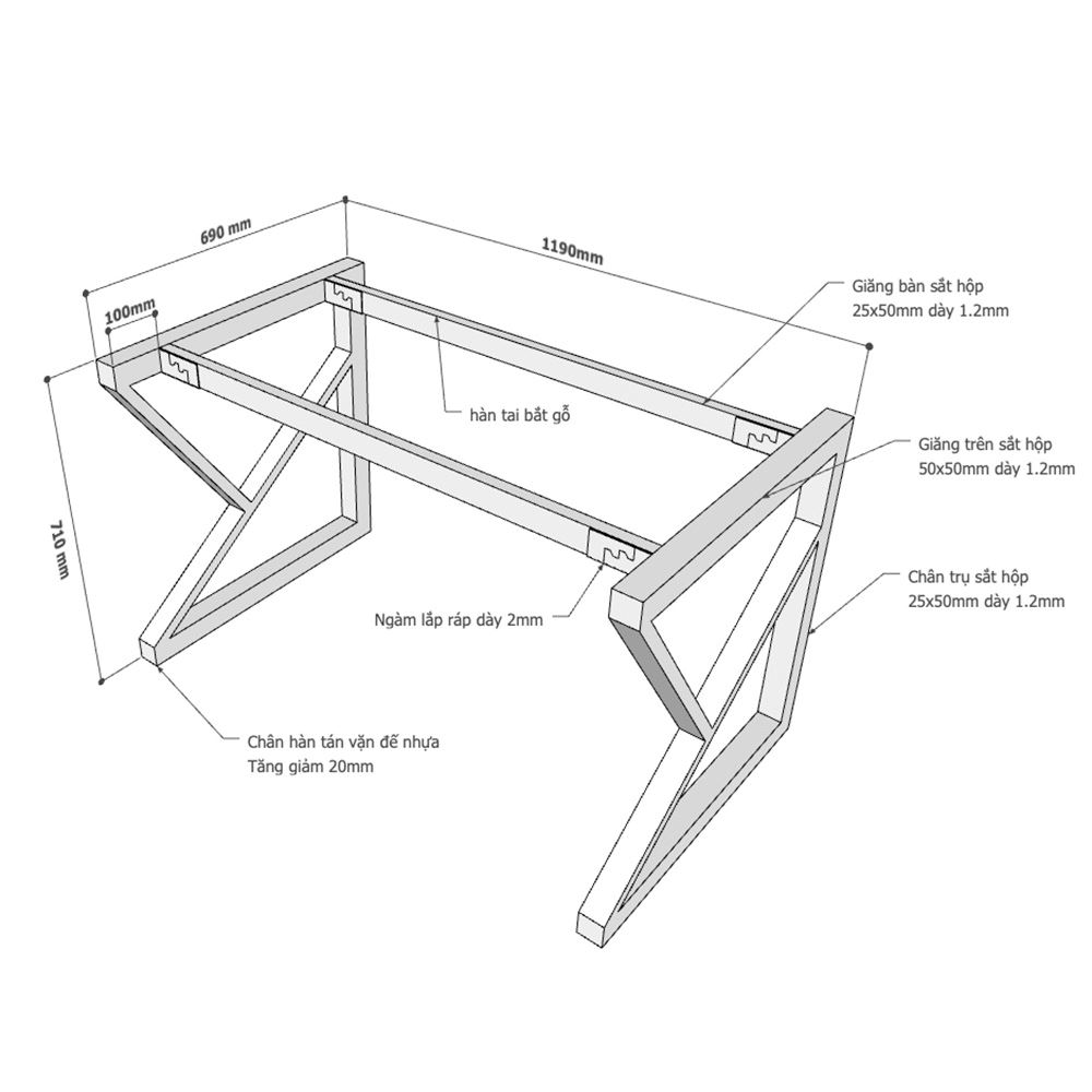 Chi tiết kích thước chân sắt lắp ráp cho bàn 120x70cm