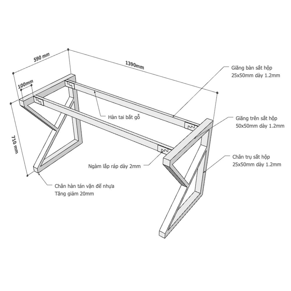 Kích thước chi tiết chân sắt lắp ráp hệ Kconcept cho bàn 140x60cm
