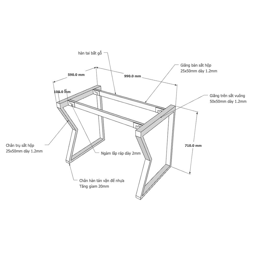 Kích thước chân sắt lắp ráp cho bàn 100x60cm