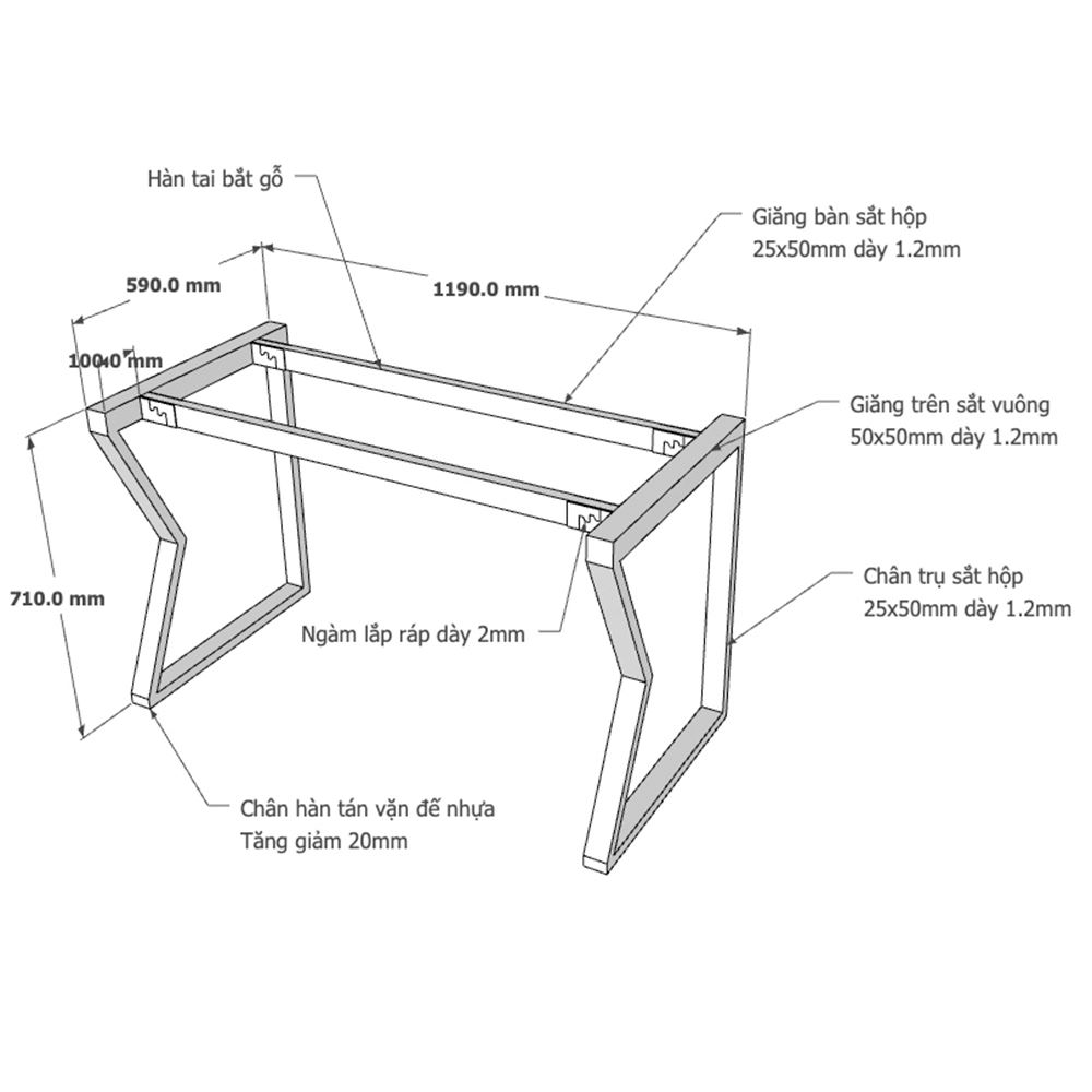 Chi tiết kích thước chân sắt lắp ráp hệ Mconcept cho bàn 120x60cm