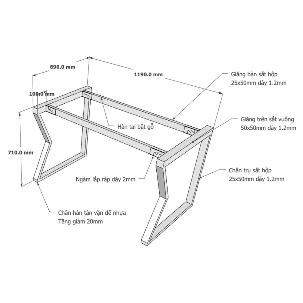 Kích thước chân sắt lắp ráp cho bàn 120x70cm