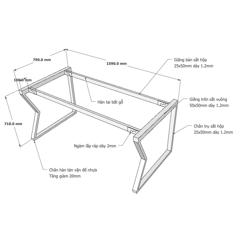 Chi tiết kích thước chân sắt lắp ráp hệ Mconcept cho bàn 160x80cm