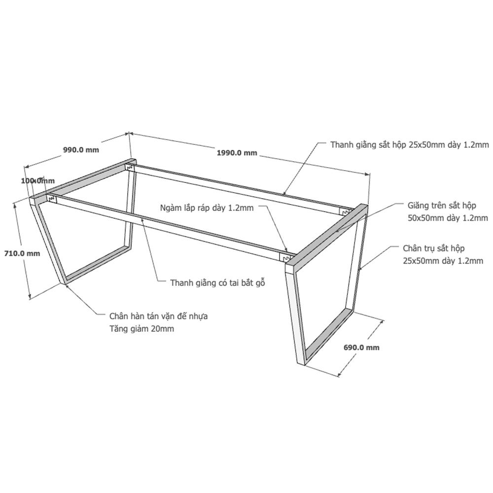 Kích thước chi tiết chân sắt lắp ráp cho bàn 200x100x75cm