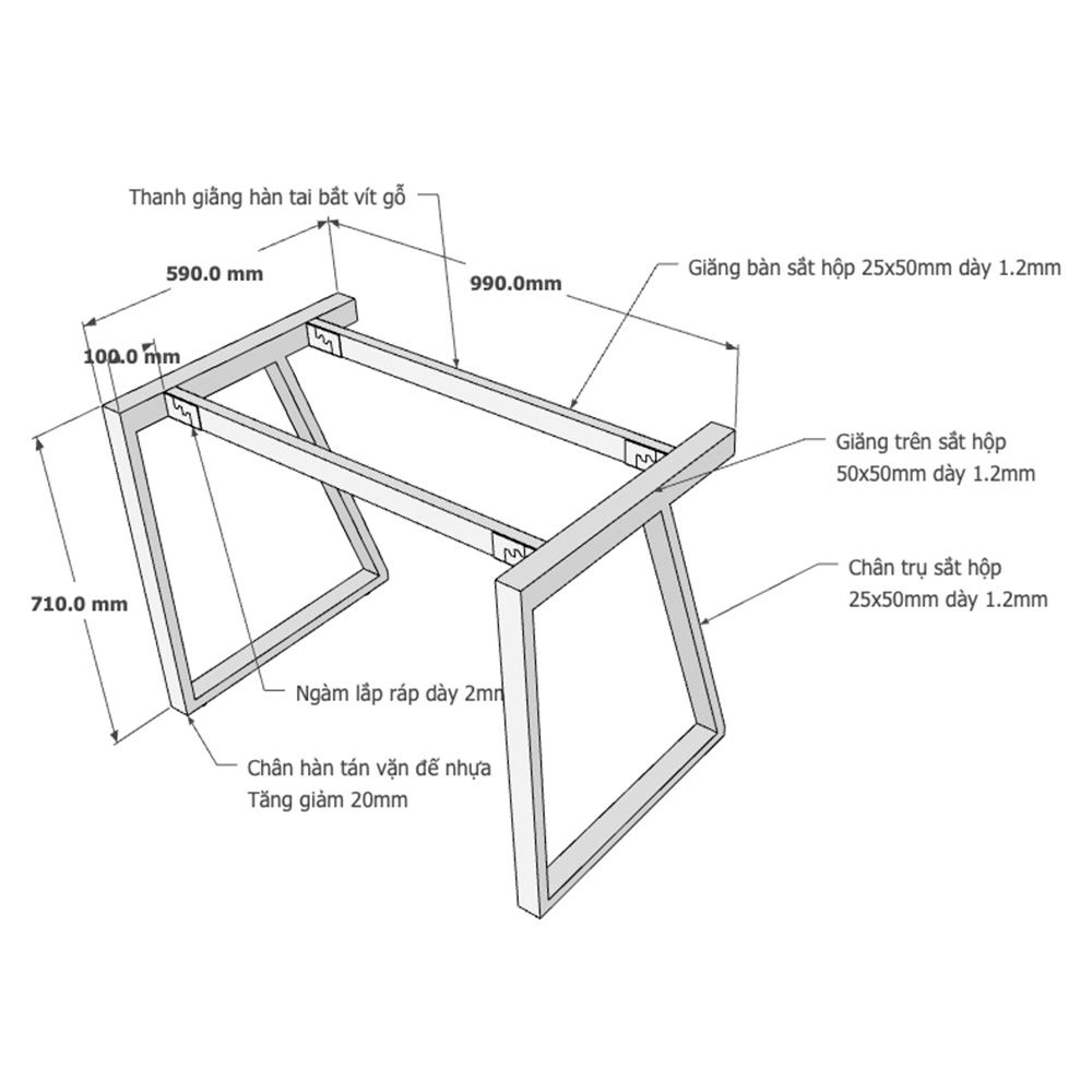 Kích thước chi tiết chân sắt lắp ráp cho bàn 100x60x75cm