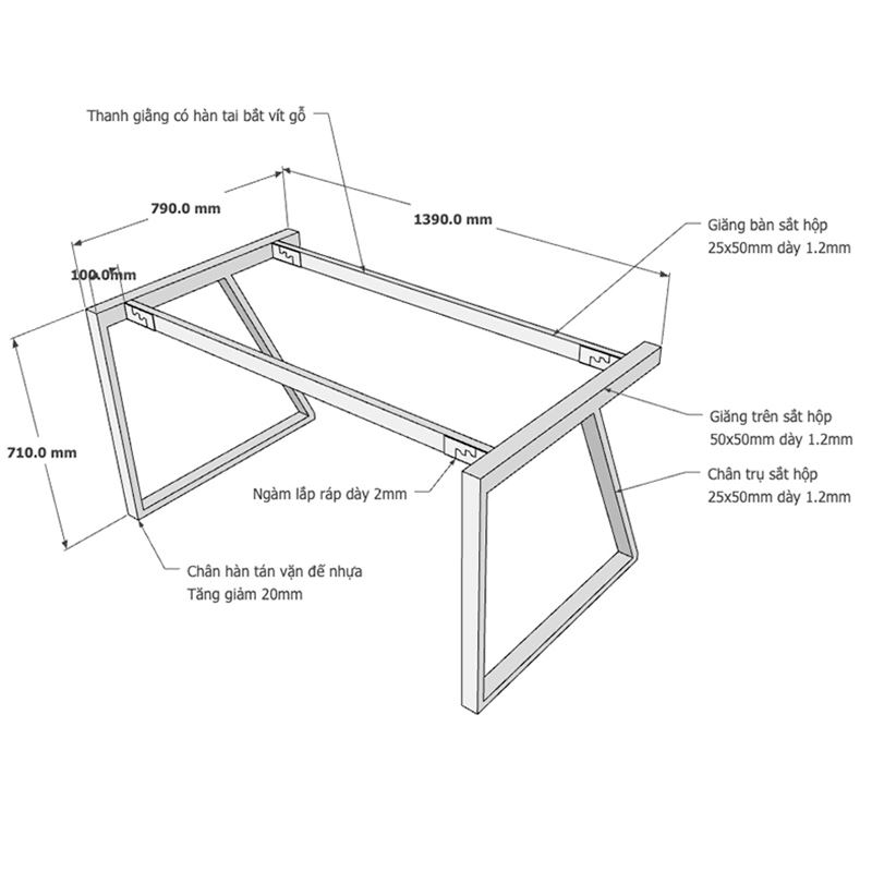 Kích thước chân sắt lắp ráp cho bàn 140x80x75cm