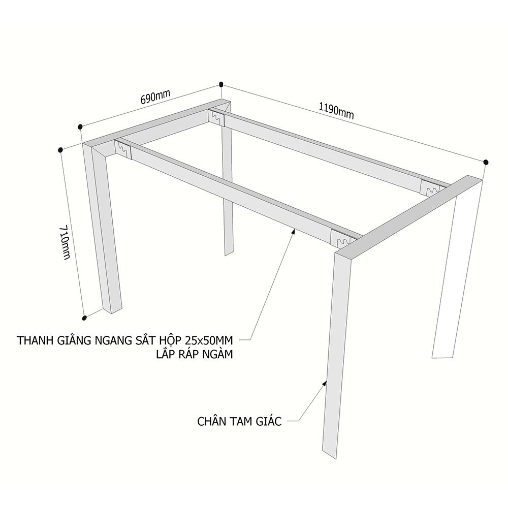 Kích thước chân sắt lắp ráp hệ Trian cho bàn 120x70cm