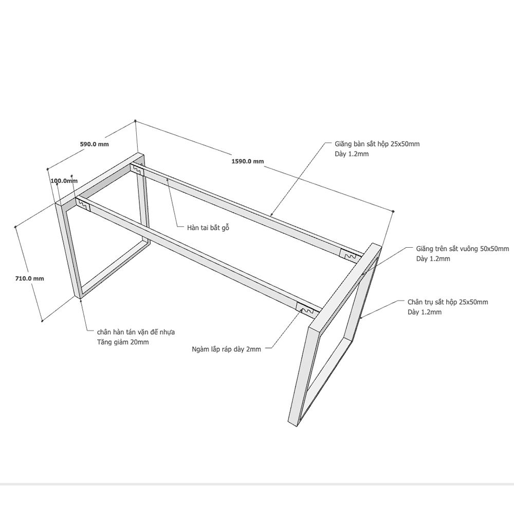 Chi tiết kích thước chân sắt cho bàn 160x60cm