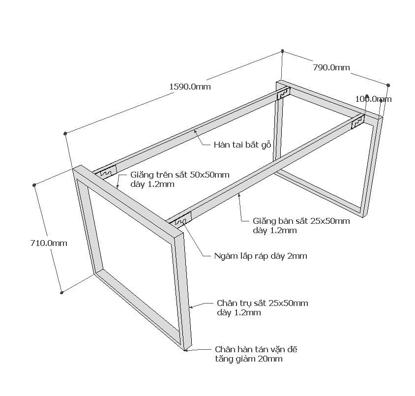 Chi tiết kích thước chân sắt rectang 160x80cm
