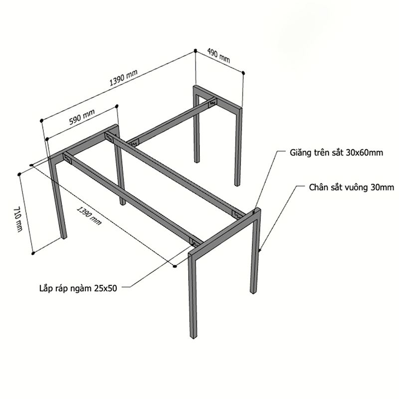 Kích thước chân sắt lắp ráp bàn chữ L 140x140cm hệ Slean