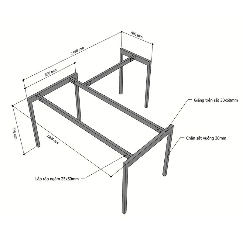 Kích thước chân sắt lắp ráp bàn chữ L 140x150cm hệ Slean