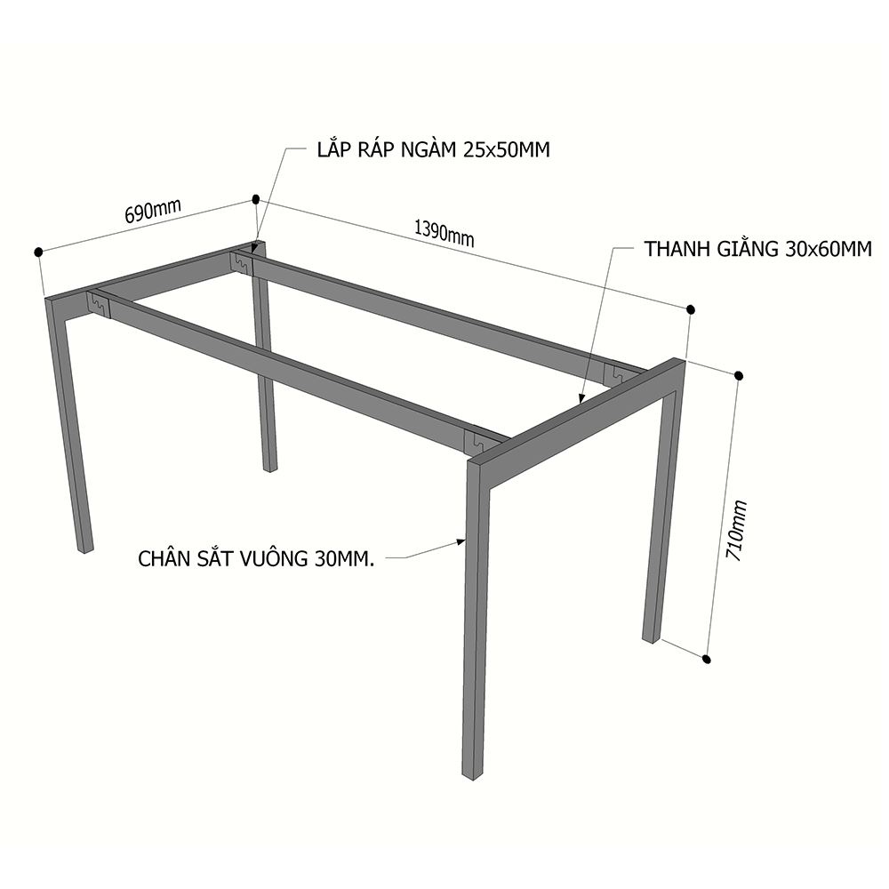 Kích thước chân sắt lắp ráp bàn 140x70cm hệ Slean