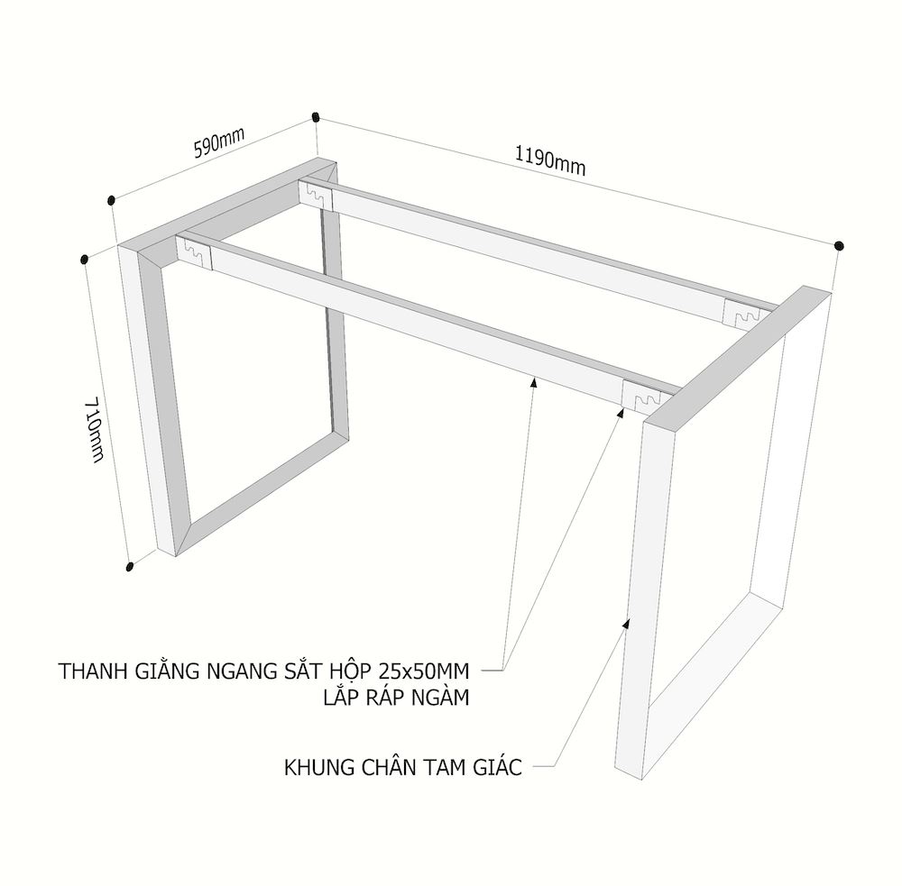 Kích thước chân sắt tam giác lắp ráp hệ Trian II cho bàn 120x60cm