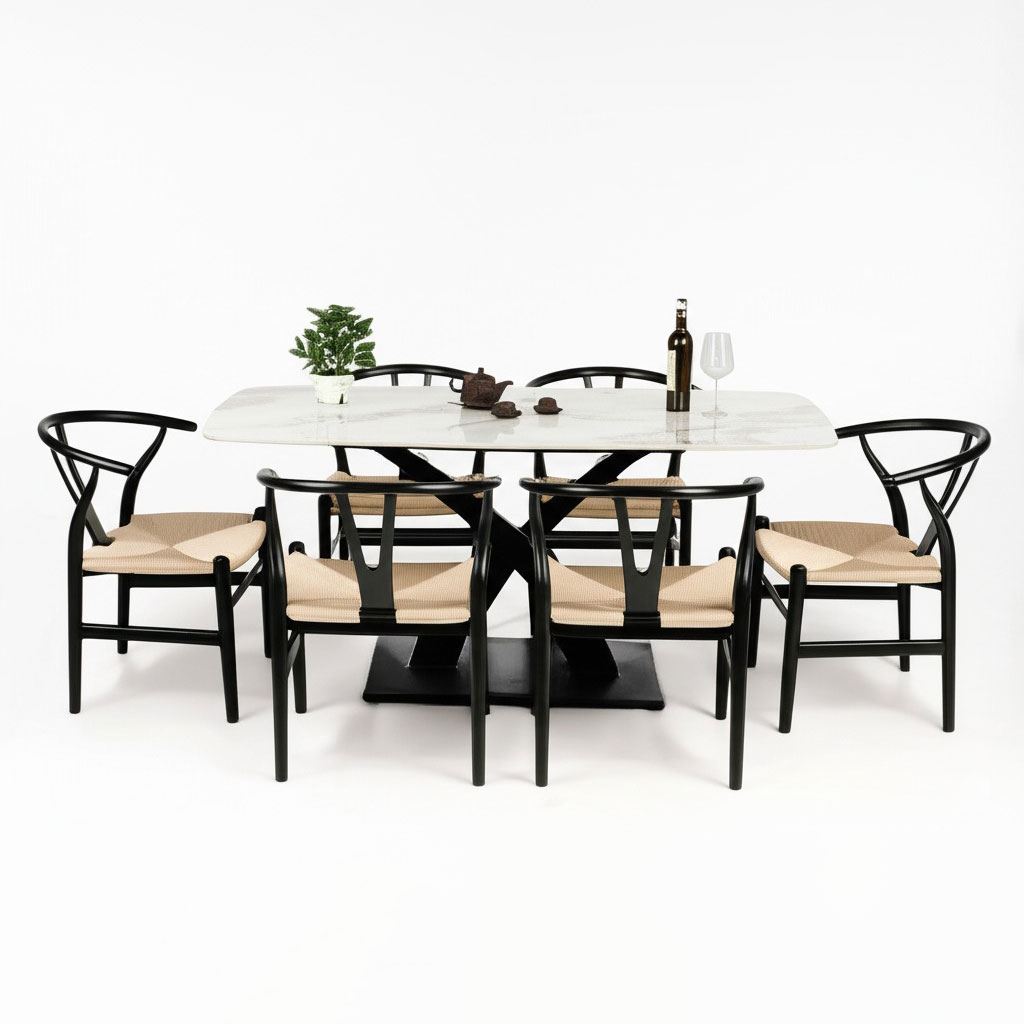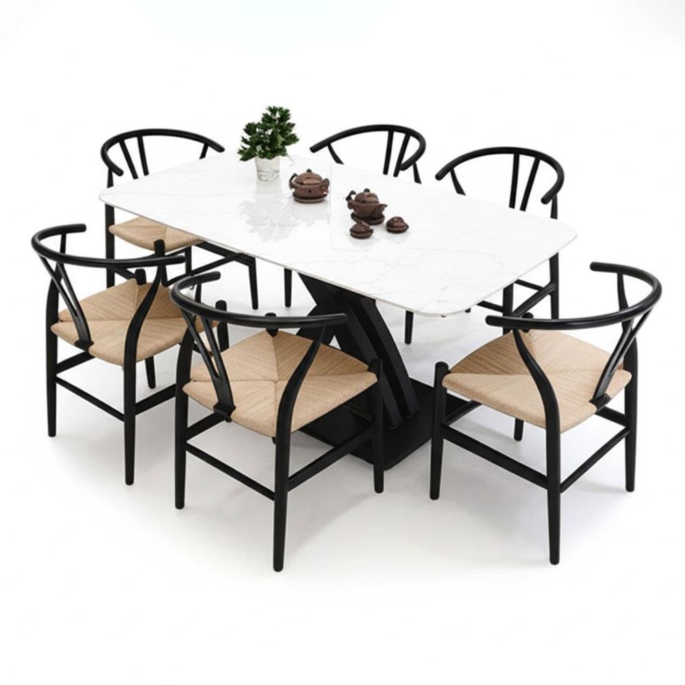 Trong combo BBA186 bao gồm 1 bàn ăn chữ nhật và 4 ghế Wishbon đan dây