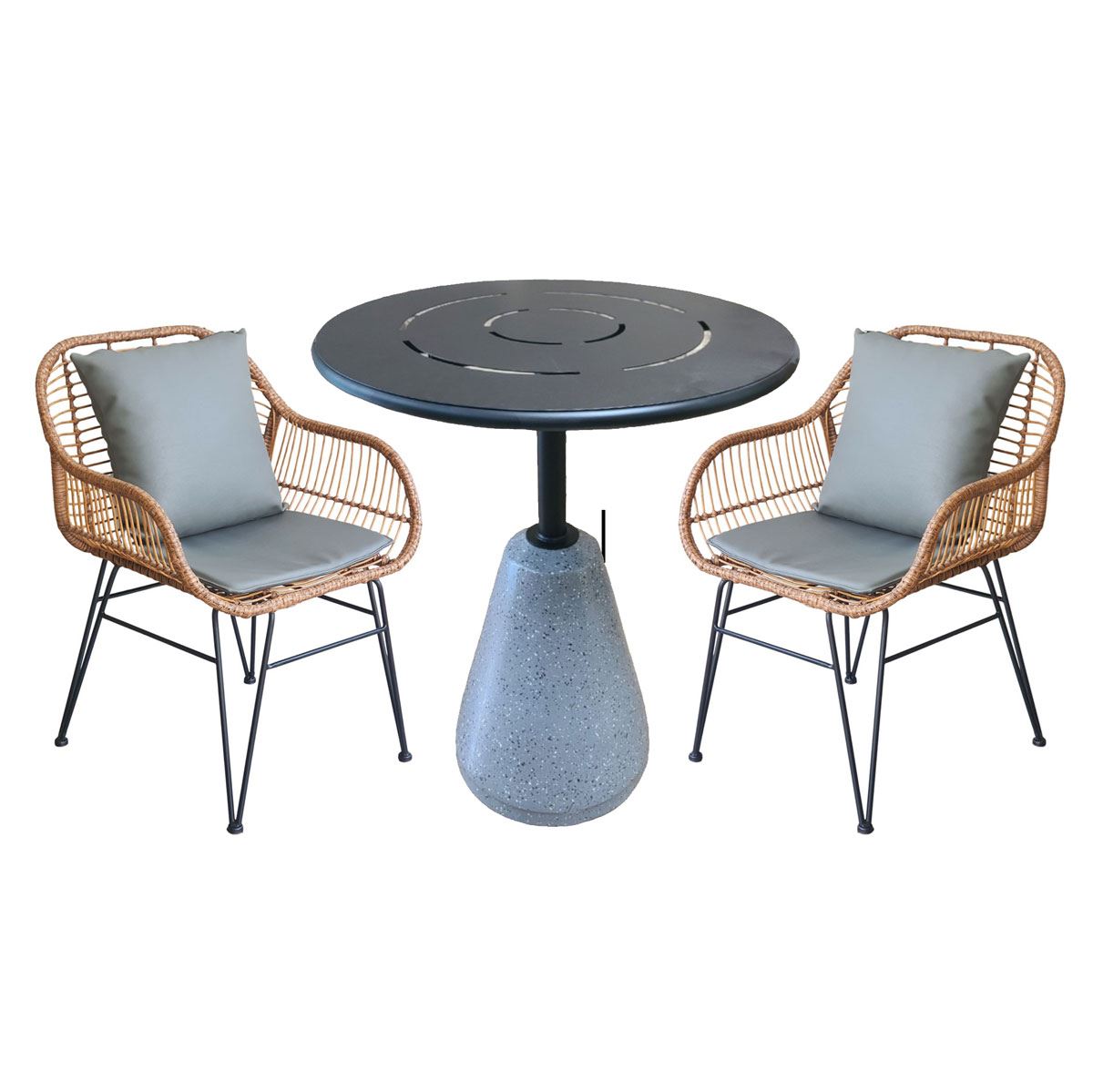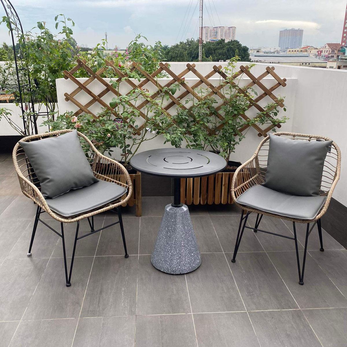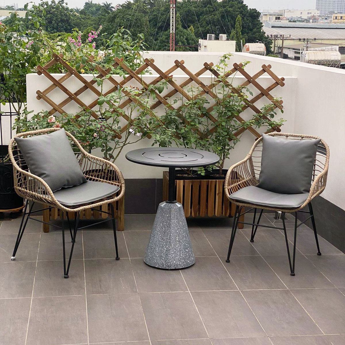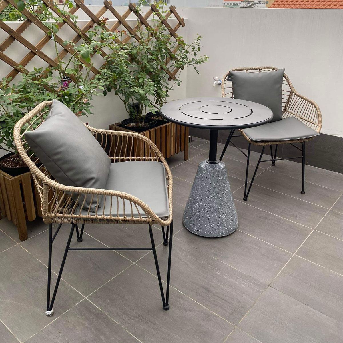 Trong combo CBCF298 bao gồm 1 bàn cafe tròn và 2 ghế giả mây.