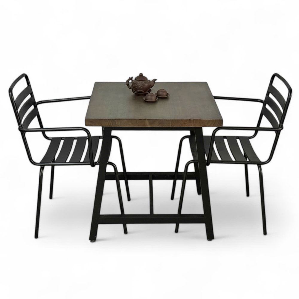 Trong combo CBNT006 bao gồm 1 bàn vuông gỗ thông và 2 ghế cafe sắt