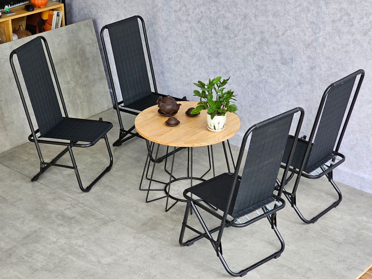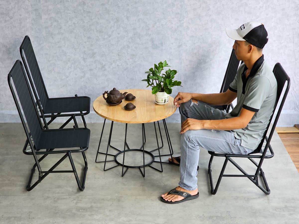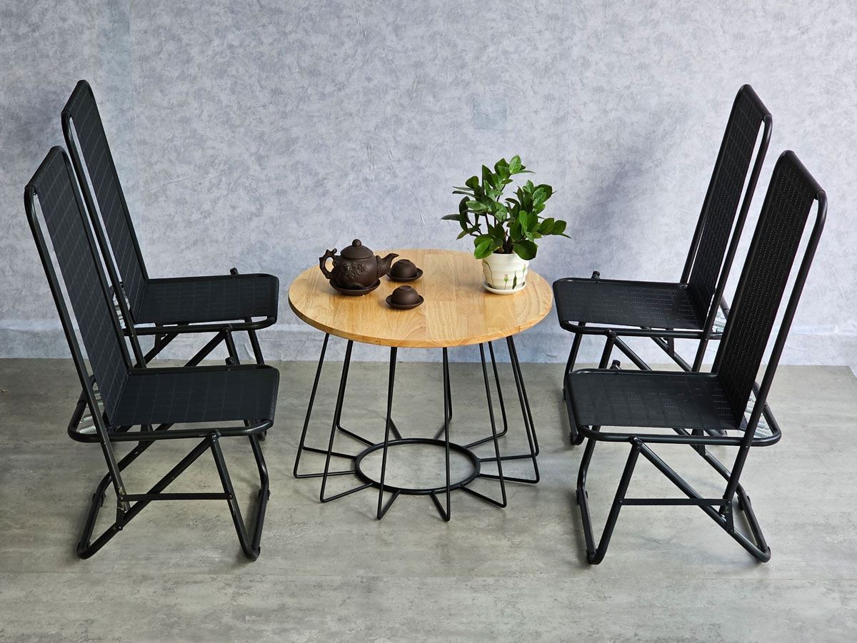 Combo bàn ghế cafe dành cho 2 người ngồi. Trong combo CBCF290bao gồm 1 bàn sofa tròn gỗ cao su và 4 ghế lưới xếp gọn.