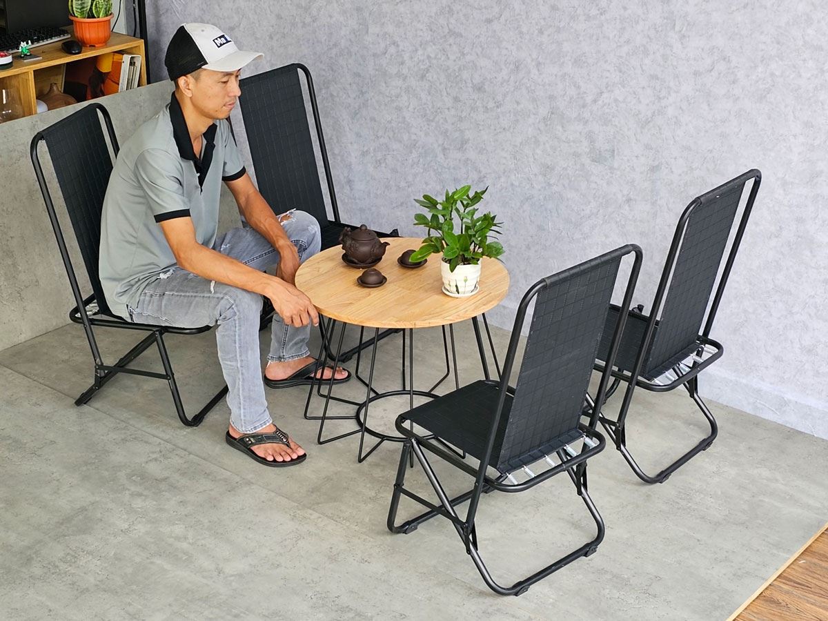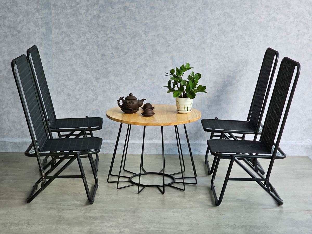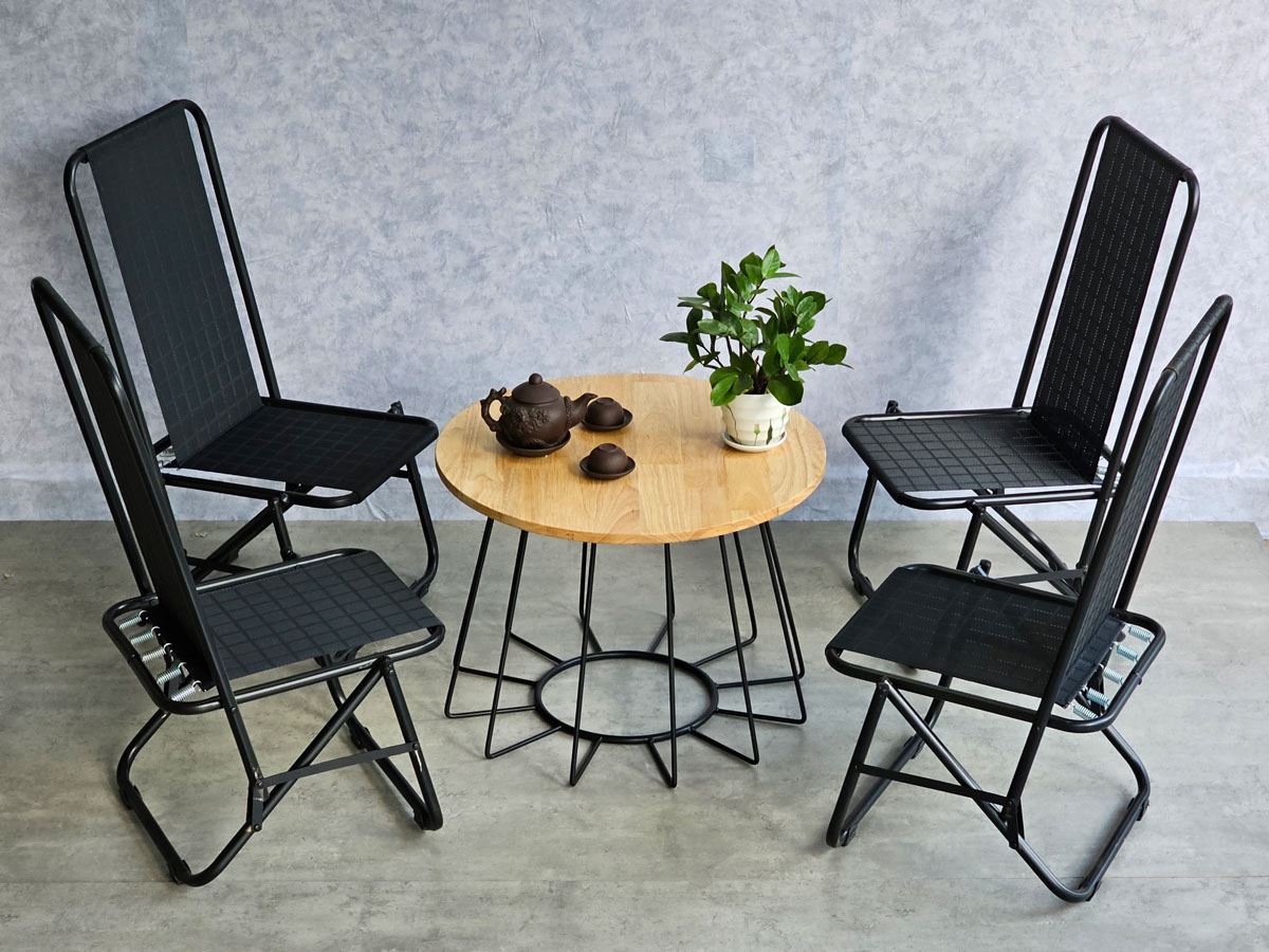Combo bàn ghế cafe dành cho 2 người ngồi. Trong combo CBCF290bao gồm 1 bàn sofa tròn gỗ cao su và 4 ghế lưới xếp gọn.