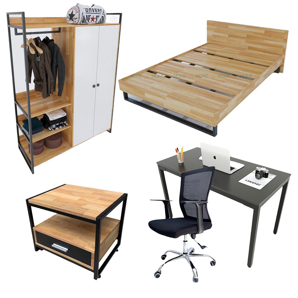 Combo Nội Thất Phòng Ngủ 6 món PN005 với giường đôi 160x200cm cho 2 người nằm thoải mái, với tủ quần áo khung sắt kết hợp với kệ rất hiện đại, tủ đầu giường giúp lưu trữ đồ thuận tiện kèm theo đó là một bộ bàn ghế cơ bản làm việc trong phòng. Các sản phẩm đều do Homeoffice thiết kế và sản xuất nên quý khách có thể thay đổi màu sắc theo yêu cầu sở thích của mình nhé.