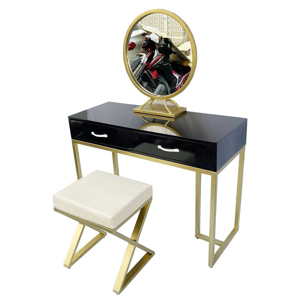 | 4 | Bộ sản phẩm gồm - Bàn 2 hộc kéo kích thước: 40x100x75cm - Ghế chữ X có nệm bọc simili màu kem khung sắt sơn vàng đồng - Gương trên bàn khung sắt tròn sơn màu vàng đồng | ![]() | 3.289000đ |