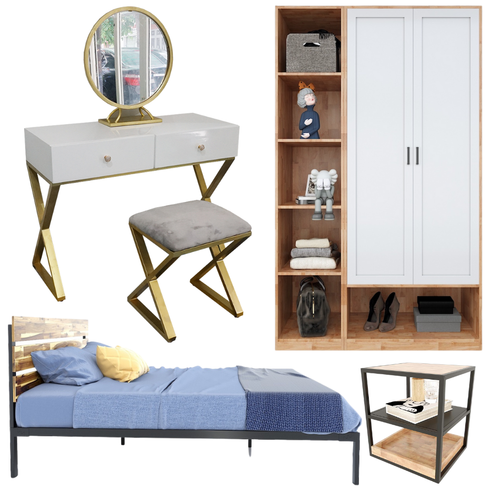 Combo Nội Thất Phòng Ngủ PN020 bộ sản phẩm kích thước lớn dành cho phòng ngủ rộng rãi với giường ngủ 1.6m dành cho hai người nằm, kệ đầu giường 3 tầng với module tủ quần áo 1m2 vừa đủ cho 2 người sử dụng và một bộ bàn trang điểm đầy đủ bàn, ghế và gương. Các sản phẩm do homeoffice thiết kế và sản xuất nên có thể thay đổi màu sắc phù hợp với sở thích và không gian phòng.