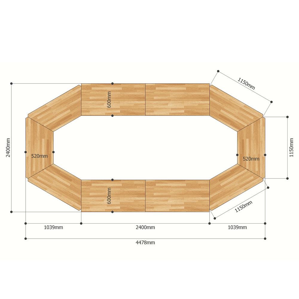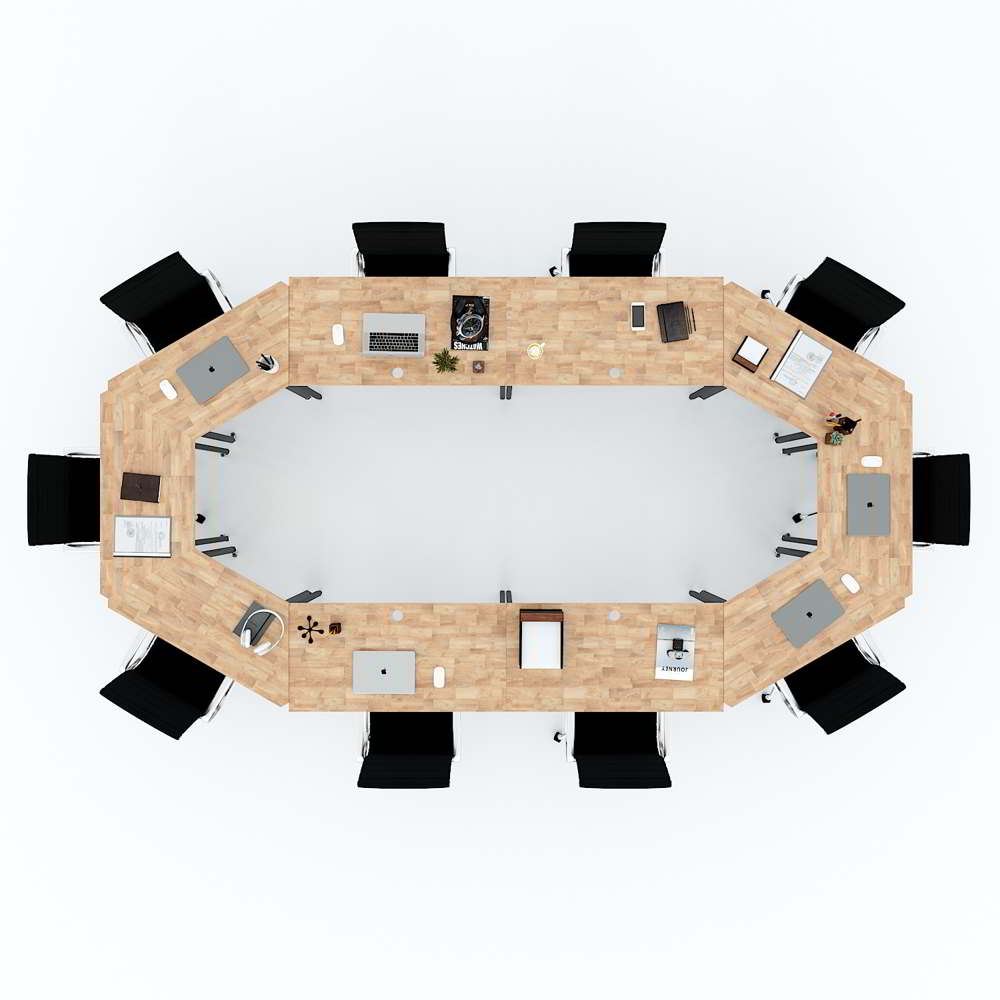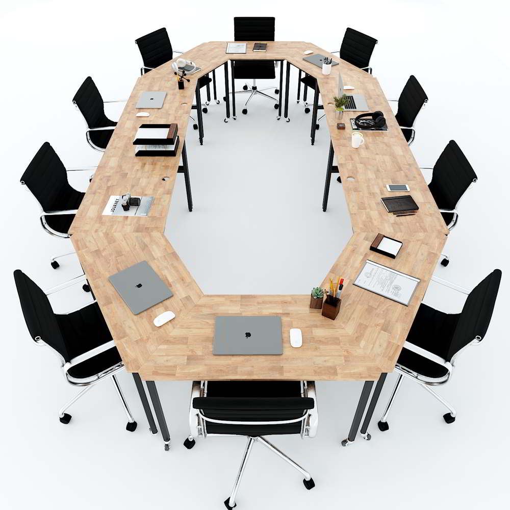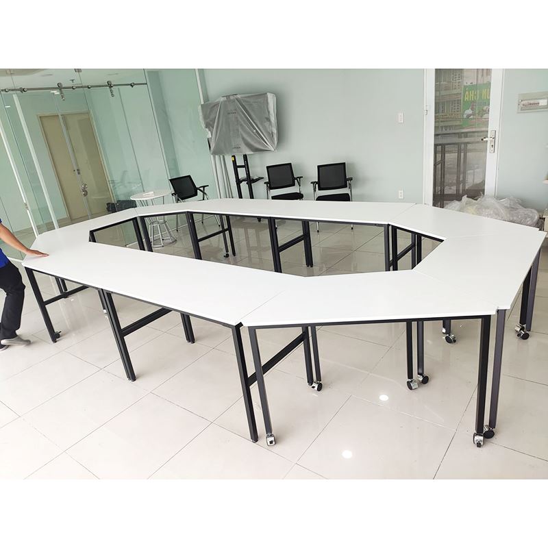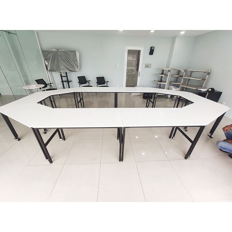 Cụm 10 bàn ghép thành bàn họp hệ Lego HBLG014 với mặt bàn gỗ cao su tự nhiên tiêu chuẩn AA dày 17mm được xử lý và chống thấm nước, đảm bảo độ bền cao kết hợp cùng khung chân sắt cơ cấu lắp ráp sơn tĩnh điện chống rỉ sét. Chân bàn được trang bị bánh xe giúp việc di chuyển, sắp xếp bàn đơn thành các cụm bàn một cách dễ dàng mà không cần tốn nhiều công sức, thời gian.