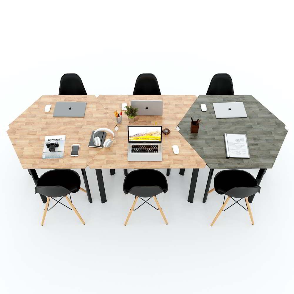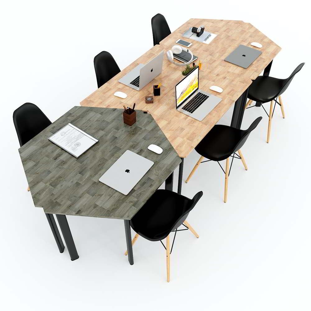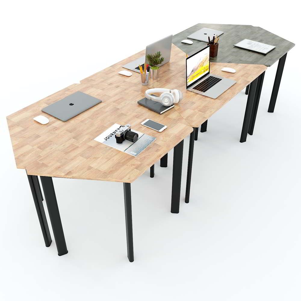 Cụm 6 bàn hình thang hệ Lego HBLG023 với mặt bàn gỗ cao su tự nhiên tiêu chuẩn AA dày 17mm được xử lý và chống thấm nước, đảm bảo độ bền cao kết hợp cùng khung chân sắt sơn tĩnh điện cao cấp chống rỉ sét, đảm bảo độ bền cao với thời gian sử dụng lâu dài. Mặt bàn thiết kế hình thang với kích thước được tính toán kỹ càng có thể dễ dàng sắp xếp bàn đơn thành các cụm bàn tùy theo quy mô và mục đích sử dụng. Nhờ tính linh hoạt cao mà cụm bàn Lego ngày càng được các doanh nghiệp, trường học ưa chuộng và sử dụng rộng rãi.