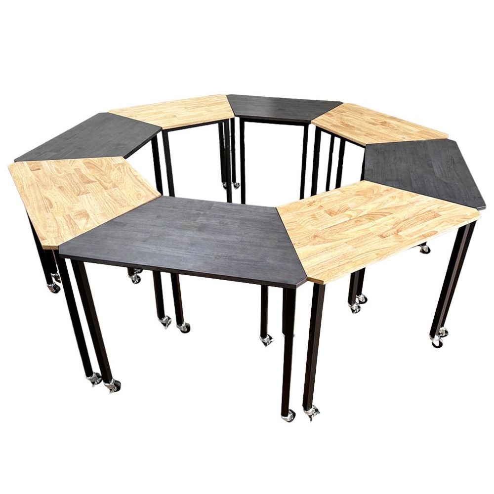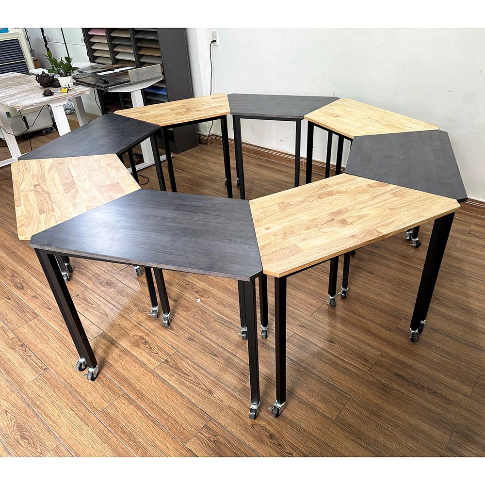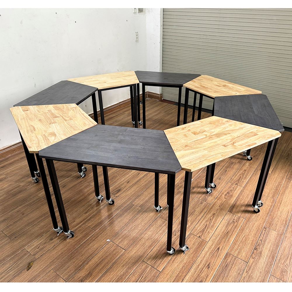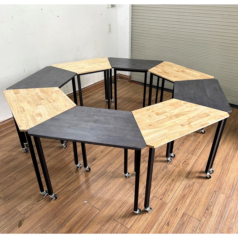 Cụm 8 bàn hình thang HBLG043 được lắp ghép từ 8 bàn hình thang mini kích thước 88x50x75cm thành module bàn cụm có kích thước 237x222x75cm, được sử dụng như bàn làm việc, bàn phòng họp hay bàn training....tại các công ty, doanh nghiệp hay trường học. Mặt bàn gỗ cao su sơn PU 5 màu sắc đẹp mắt kết hợp khung chân sắt hàn cố định chắc chắn có khả năng chịu lực tốt. Bàn Lego với đặc tính linh hoạt cao đang dần trở thành hệ bàn được các doanh nghiệp, trường học...tin dùng và sử dụng.