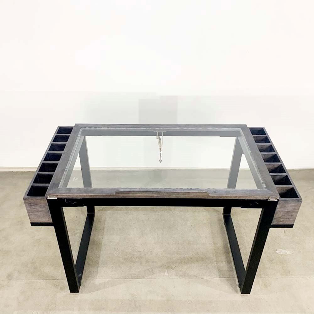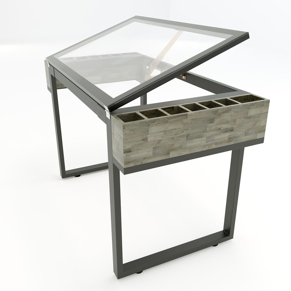 DD68005- Bàn vẽ kiến trúc DraftingDesk chân sắt mặt kính với kích thước đa dạng phù hợp với khổ A1 hoặc A0, mặt bàn có thể nâng hạ độ nghiêng tùy chỉnh dễ dàng với khớp nâng hiện đại, hai bên hông với hai kệ gỗ chia ô giúp để bút vẽ, thước hay vật dụng vẽ một cách tiệ lợi.