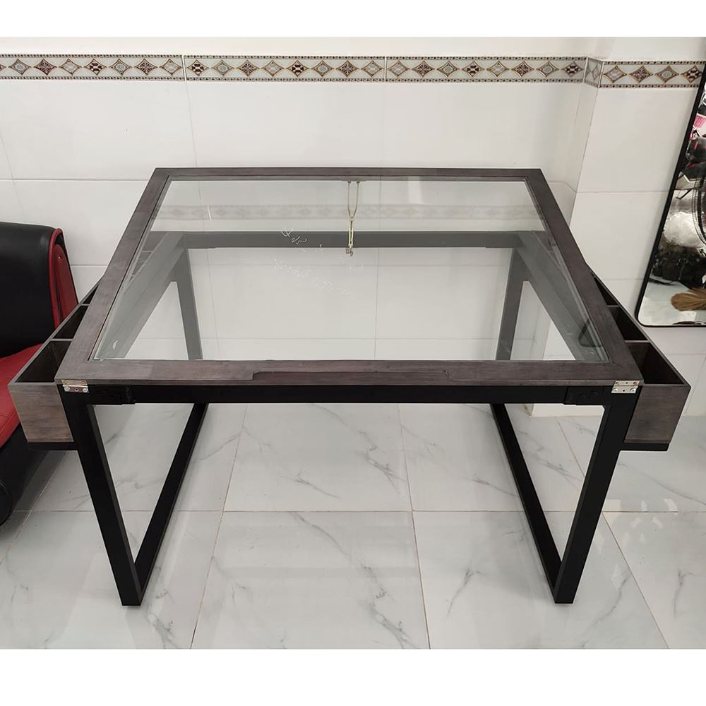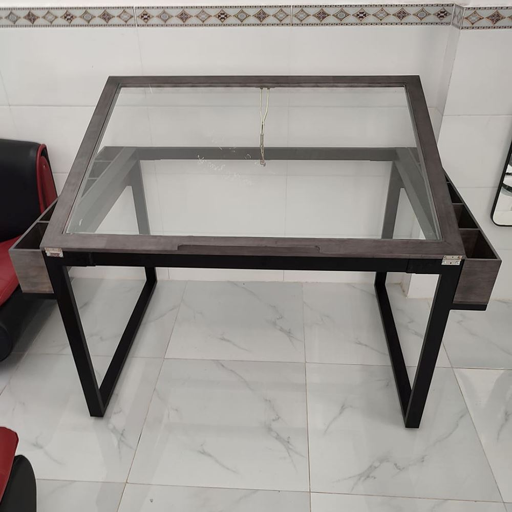 Bàn với hệ khung chân bằng sắt hộp 25x50mm và sắt 50x50mm lắp ráp ngàm chắc chắn, hệ mặt bàn khung sắt dán mặt kính cường lực dày 5mm với hệ khung nâng được bắt vào khung chân bằng vít bắt sắt liên kết
