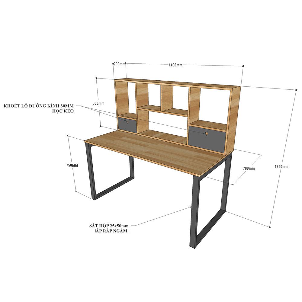 Kích thước mặt bàn 70x140cm đủ lớn để kết hợp với hệ kệ kích thước sâu 20cm còn lại không gian bàn sử dụng 50cm khá rộng rãi để học với laptop hay sách vở, mẫu bàn rất phù hợp cho mọi không gian gia đình sử dụn làm bàn học, bàn làm việc đều được