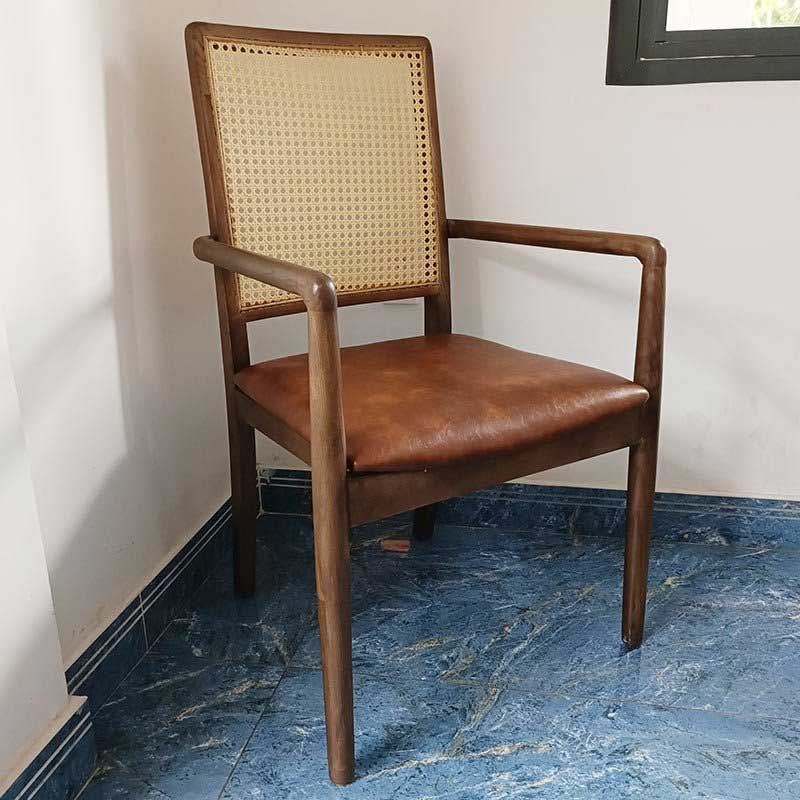 Ghế cafe, ghế ăn Mila có tay khung gỗ Ash GCF146 có thiết kế mang hơi hướng cổ điển, được nhiều khách lựa chọn bởi đem lại cảm giác mộc mạc, yên bình cho không gian sử dụng. Khung ghế gỗ tần bì (gỗ Ash) được xử lý qua nhiều công đoạn để chống mối mọt, chống cong vênh và vân gỗ được thể hiện sắc nét sang trọng. Nệm ngồi bọc simili êm ái mang đến sự thoải mái khi ngồi cũng như dễ dàng vệ sinh. Điểm nhấn của mẫu ghế Mila là lưng ghế lưới giả mây mắt cáo đẹp mắt.