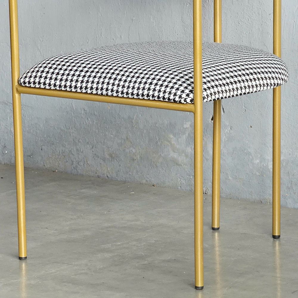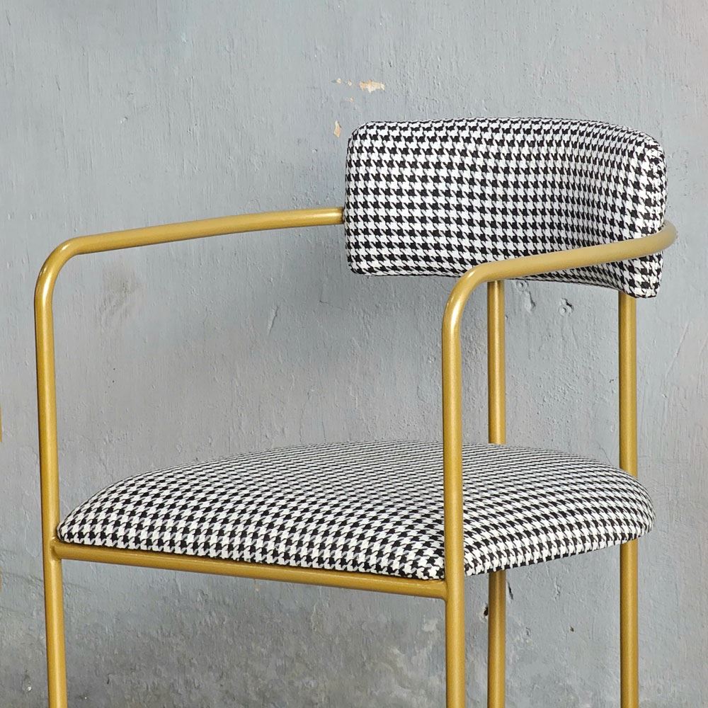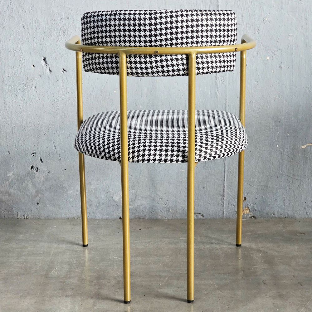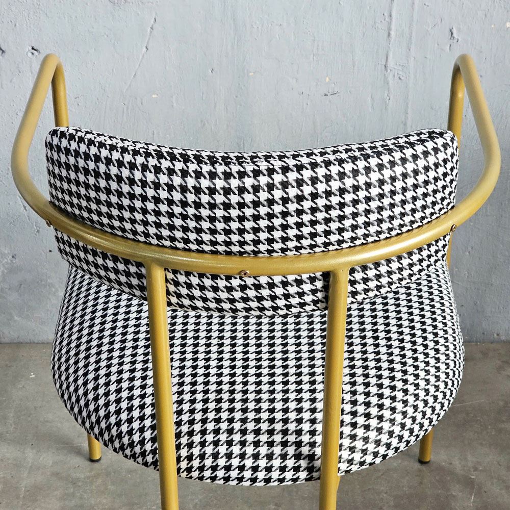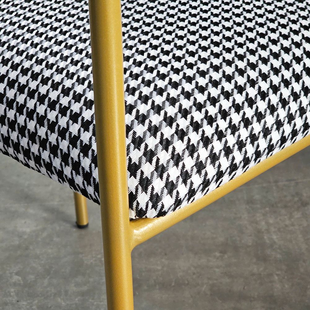 Điều đặc biệt tạo nên điểm nhấn độc đáo cho chiếc ghế này, chính là họa tiết houndstooth. Họa tiết này không chỉ là một xu hướng nhất thời, mà là biểu tượng của sự sang trọng và quý phái, đã từng làm say đắm giới quý tộc và thượng lưu trên khắp thế giới. Những hình dạng trừu tượng như nanh sói được kết hợp hài hòa, tinh tế, tạo nên một vẻ đẹp vượt thời gian, khiến người nhìn không thể rời mắt. Họa tiết houndstooth đậm chất quý tộc, sang trọng kết hợp với kiểu dáng uốn cong mềm mại, uyển chuyển của khung sắt, tạo nên một tổng thể hài hòa, độc đáo và thu hút mọi ánh nhìn.