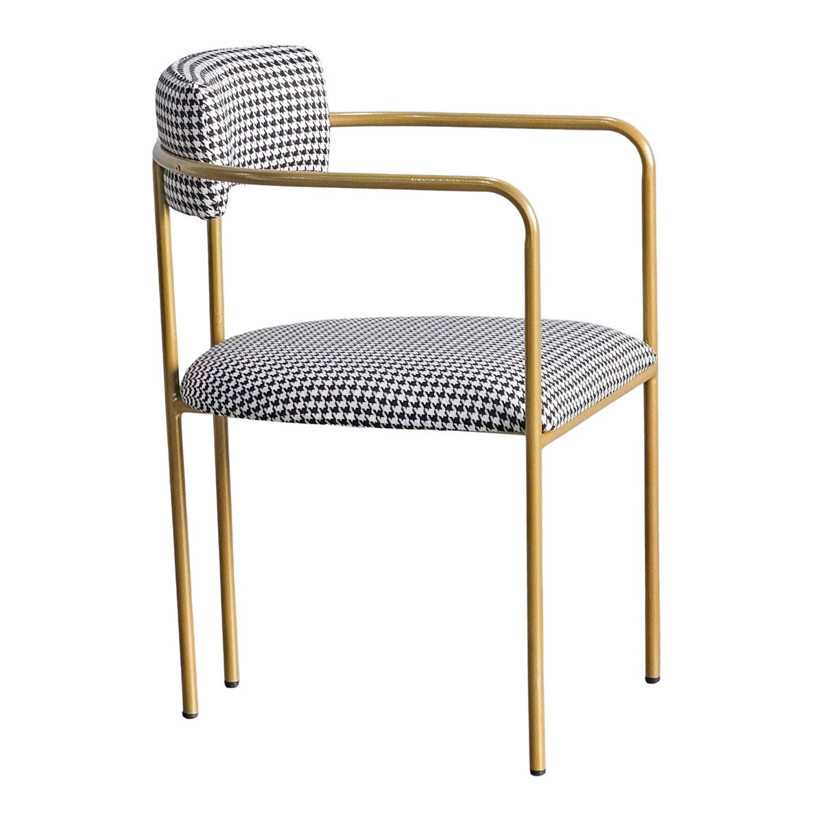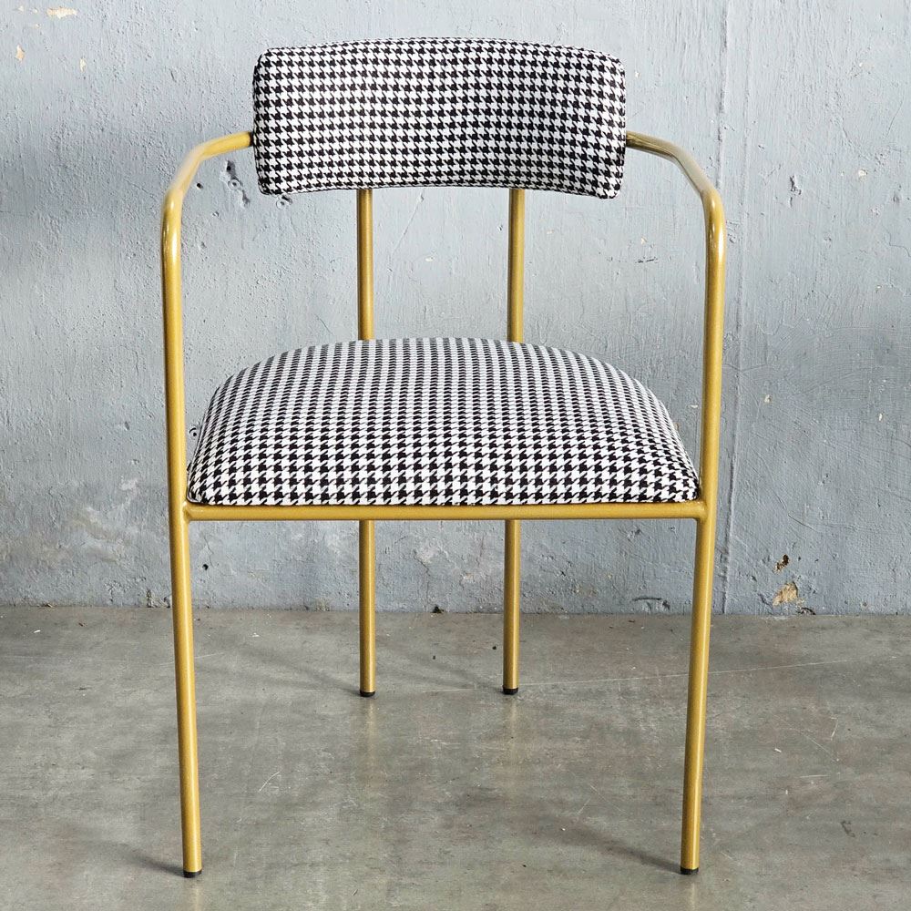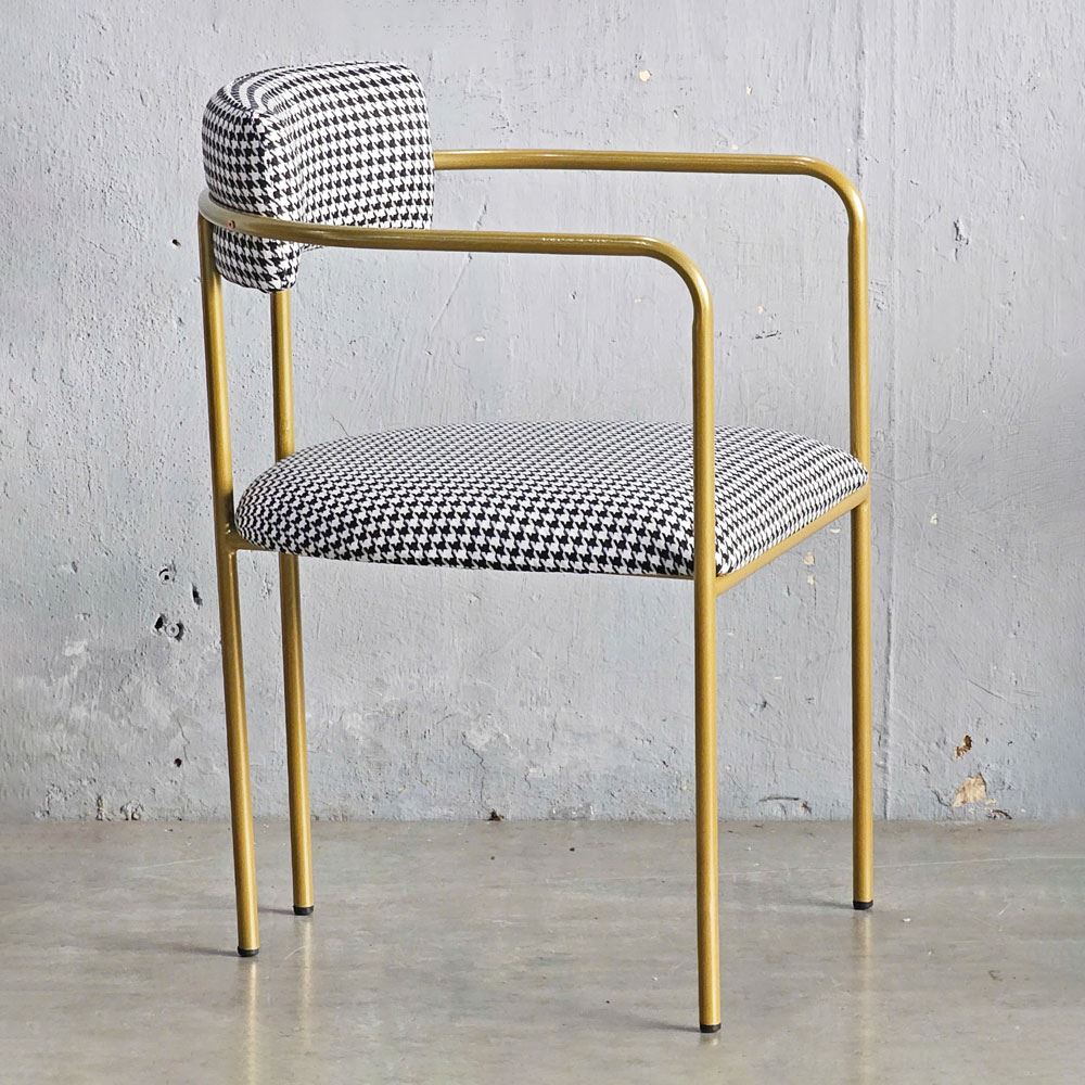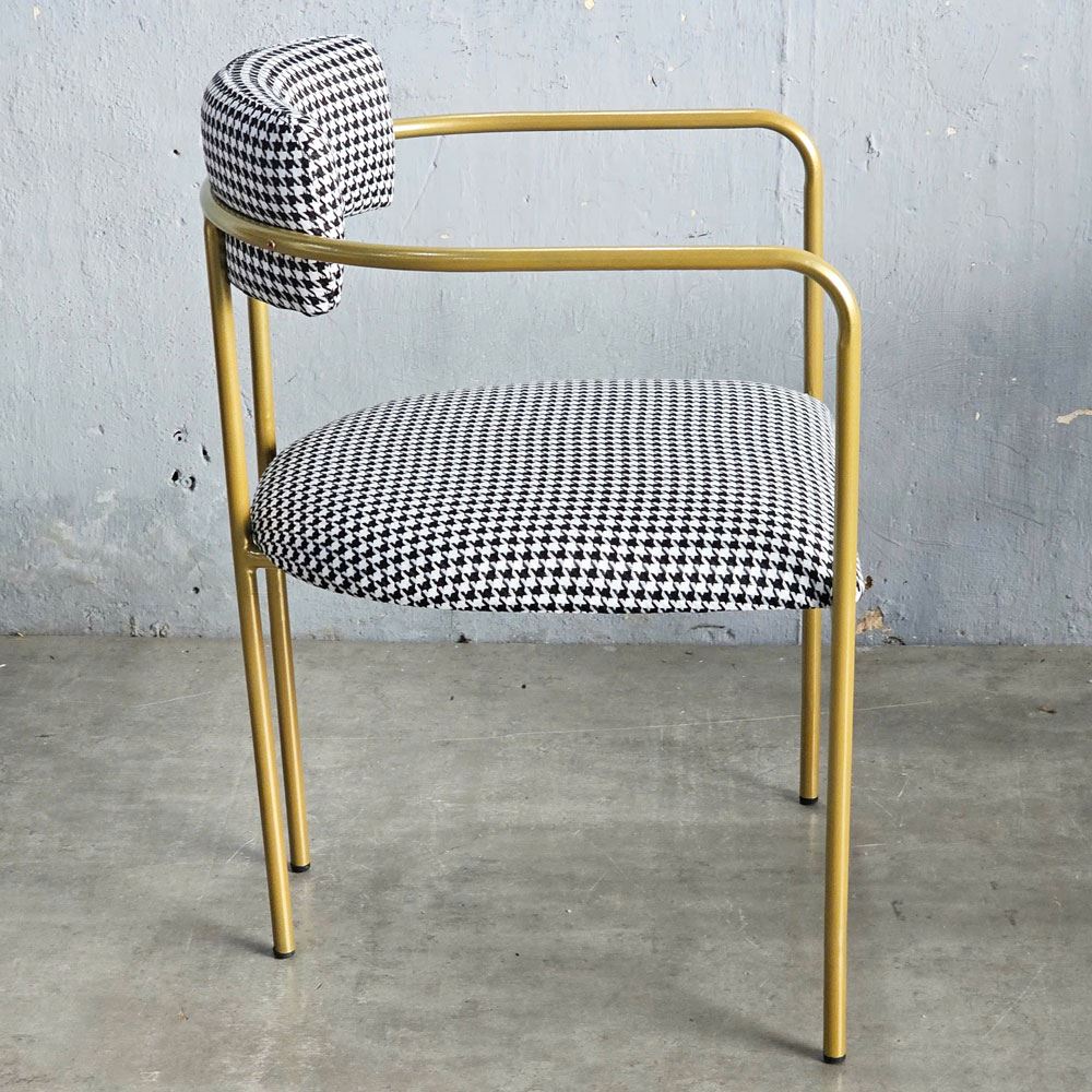 Điều đặc biệt tạo nên điểm nhấn độc đáo cho chiếc ghế này, chính là họa tiết houndstooth. Họa tiết này không chỉ là một xu hướng nhất thời, mà là biểu tượng của sự sang trọng và quý phái, đã từng làm say đắm giới quý tộc và thượng lưu trên khắp thế giới. Những hình dạng trừu tượng như nanh sói được kết hợp hài hòa, tinh tế, tạo nên một vẻ đẹp vượt thời gian, khiến người nhìn không thể rời mắt. Họa tiết houndstooth đậm chất quý tộc, sang trọng kết hợp với kiểu dáng uốn cong mềm mại, uyển chuyển của khung sắt, tạo nên một tổng thể hài hòa, độc đáo và thu hút mọi ánh nhìn.