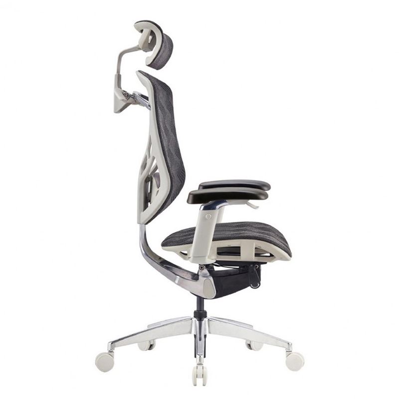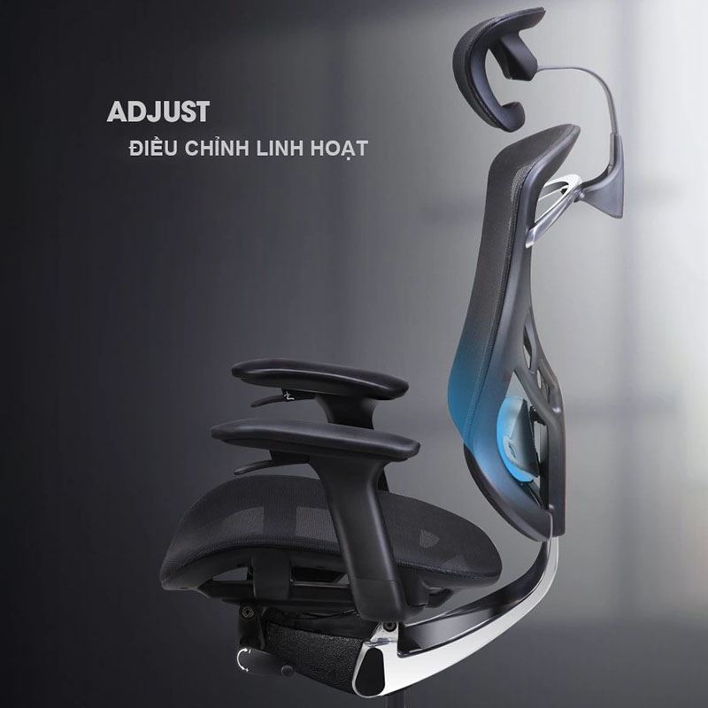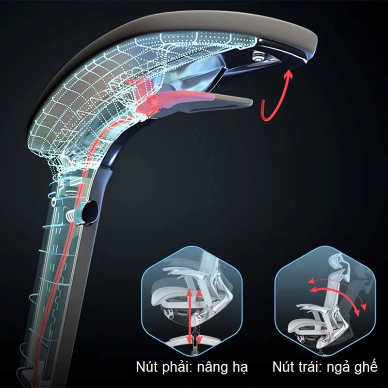 - Tựa đầu : Được bọc lưới cao cấp. Đặc biệt thiết kế tựa đầu điều chỉnh được ( điều chỉnh góc, lên/xuống, trước/sau ) giúp nâng đỡ trọng lượng của đầu và chia sẻ áp lực lên đốt sống cổ.