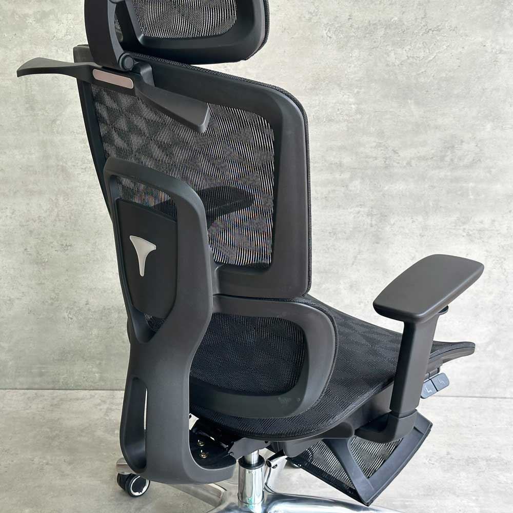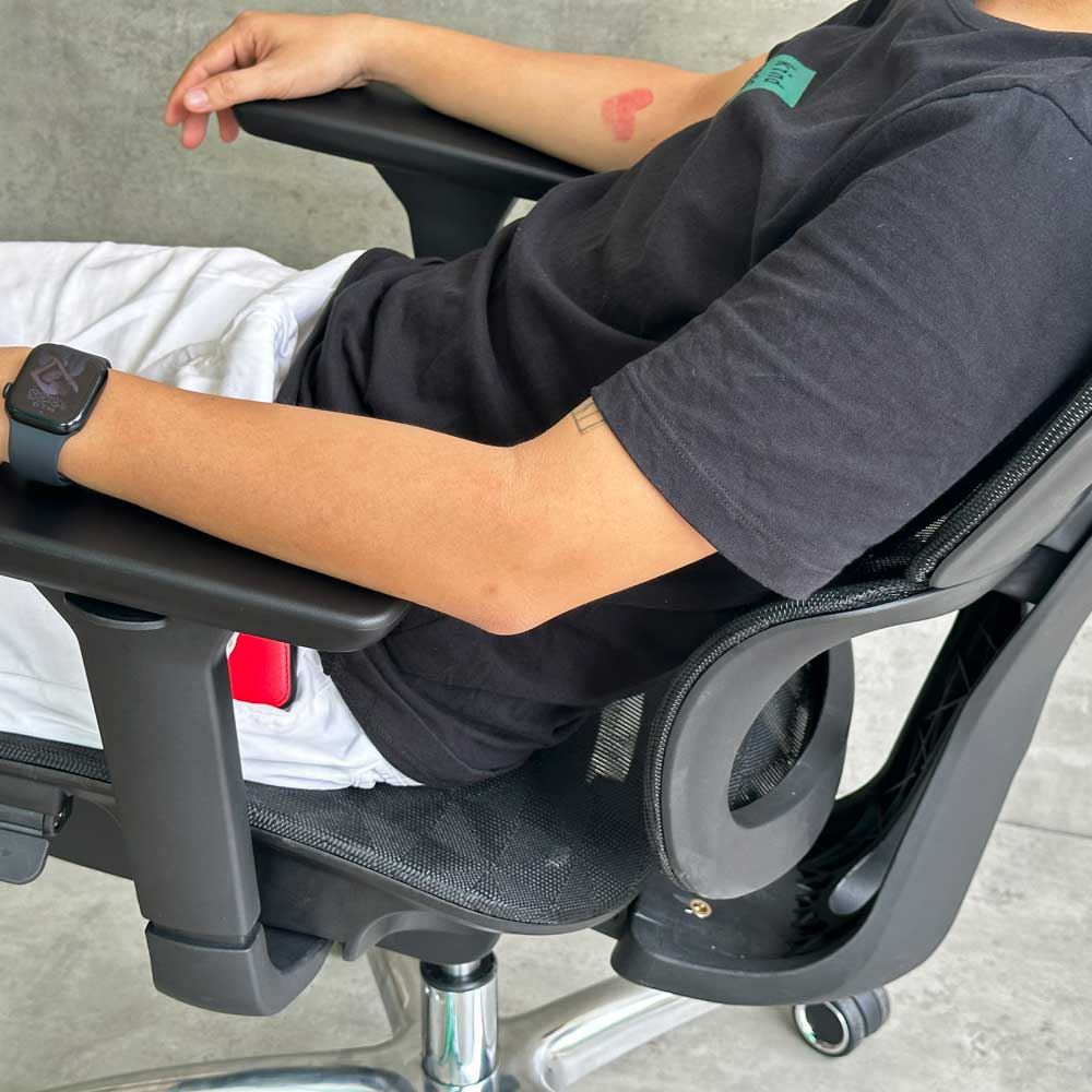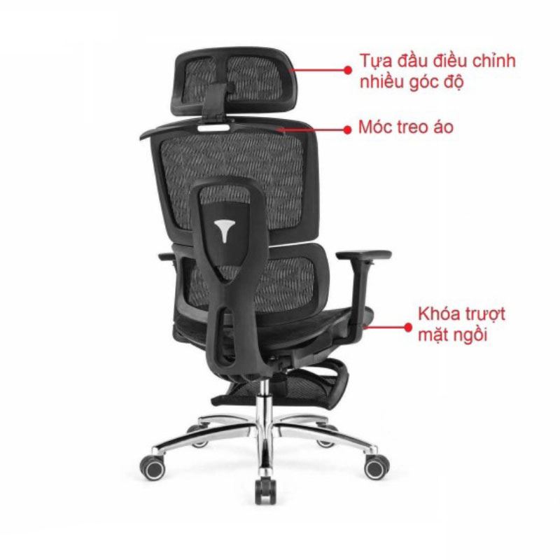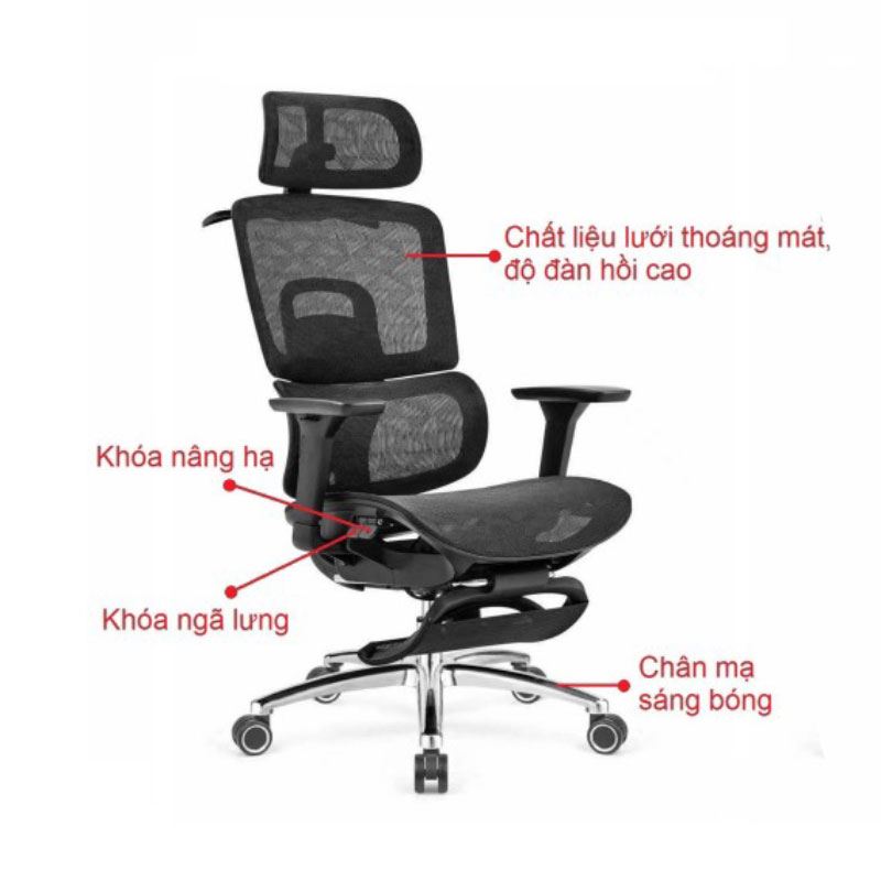 - Đệm ngồi: chất liệu lưới thoáng khí, chống nóng ẩm. Đặc biệt mặt ghế được thiết kế dốc người về phía sau giúp người ngồi không bị trượt về phía trước, tạo sự tì đỡ cho khung xương chậu.