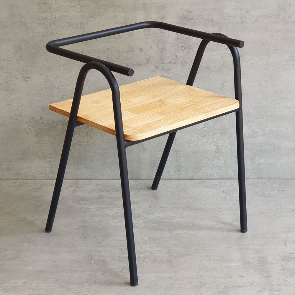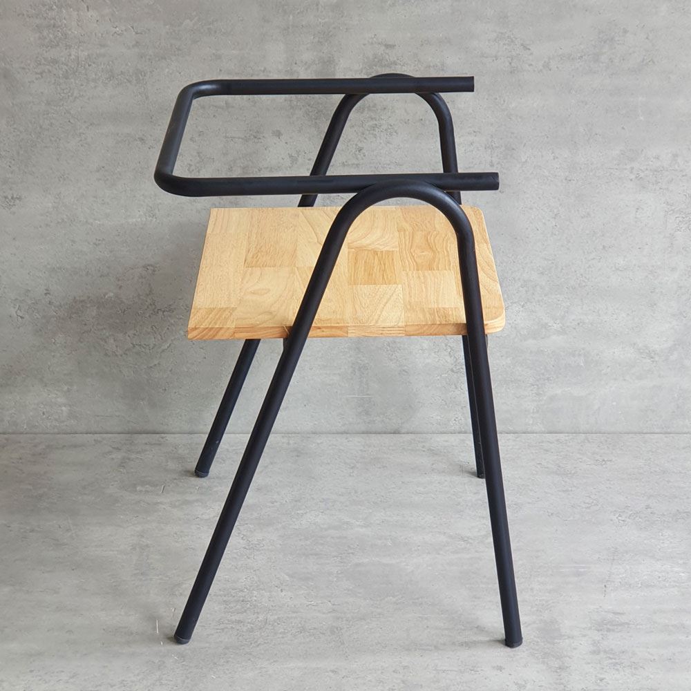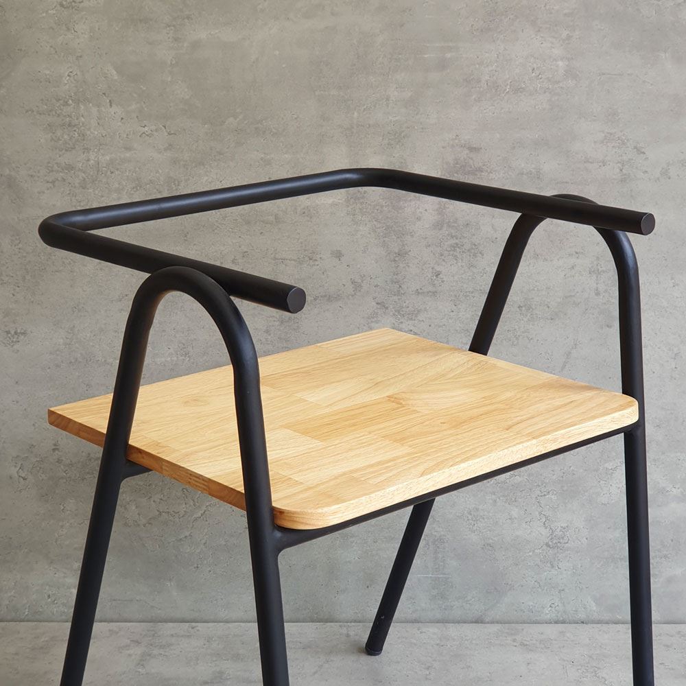 Khung ghế được làm từ sắt tròn phi 22 dày 1.2mm sơn tĩnh điện, đảm bảo độ bền bỉ và chắc chắn theo thời gian. Mặt ngồi và tựa lưng được làm từ gỗ cao su AA, một loại gỗ tự nhiên có độ bền cao, vân gỗ đẹp và màu sắc ấm áp. Gỗ cao su AA được xử lý PU chống thấm và chà nhám kỹ lưỡng, không chỉ mang lại vẻ đẹp sang trọng, mà còn tạo cảm giác thoải mái khi chạm vào.