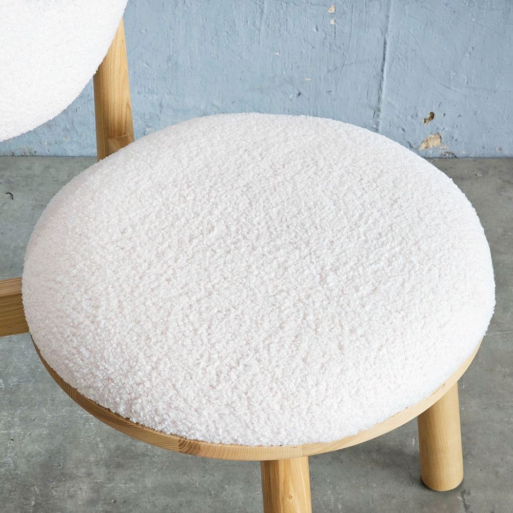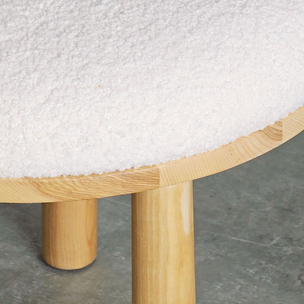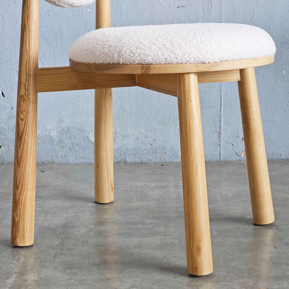 Chân ghế được làm từ gỗ tần bì tự nhiên, với những đường vân gỗ tinh tế hiện lên rõ nét, mang đến vẻ đẹp mộc mạc, gần gũi với thiên nhiên. Màu sắc gỗ tự nhiên ấm áp, hòa quyện cùng màu trắng kem của lớp vải boucle, tạo nên một bảng màu trung tính, dễ dàng phối hợp với nhiều phong cách nội thất khác nhau.